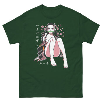 Authentic Typography: Her name, かまどねずこ (Kamado Nezuko), is written vertically in elegant Japanese text. Furthermore, the inclusion of the term “エッチ” adds a layer of playful, provocative edge, positioning this as a distinctive soft ecchi anime shirt for a more mature fan.