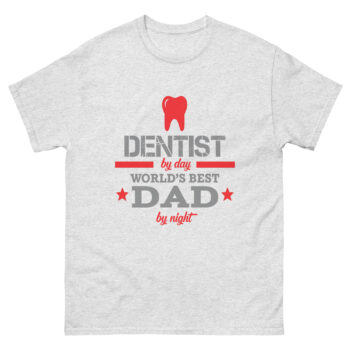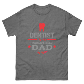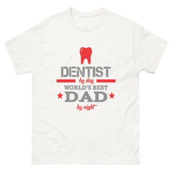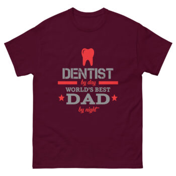 This t-shirt features bold text in gray and red that reads: “Dentist by Day – World’s Best Dad by Night.” A red tooth graphic adds a fun professional touch. It’s the perfect shirt for dentists who are proud dads, blending their career and fatherhood into one stylish design.