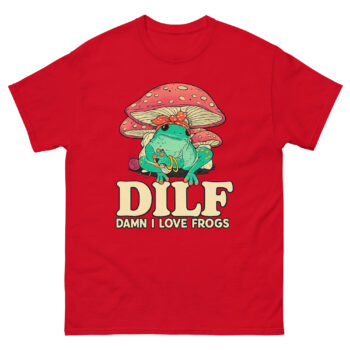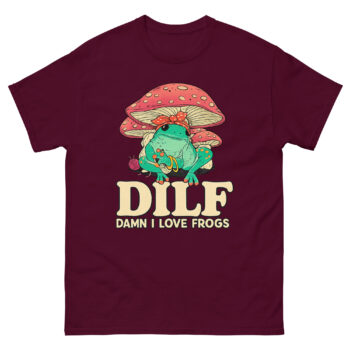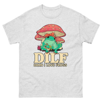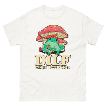 If you’re proud to be a frog fanatic, this “DILF – Damn I Love Frogs” t-shirt is the perfect way to show it off. With a retro-style bullfrog design under mushrooms and bold funny lettering, this shirt makes a quirky gift for frog lovers, meme collectors, and anyone with a great sense of humor.