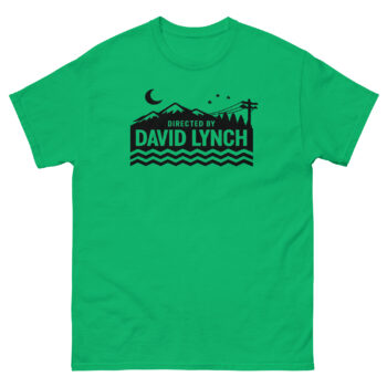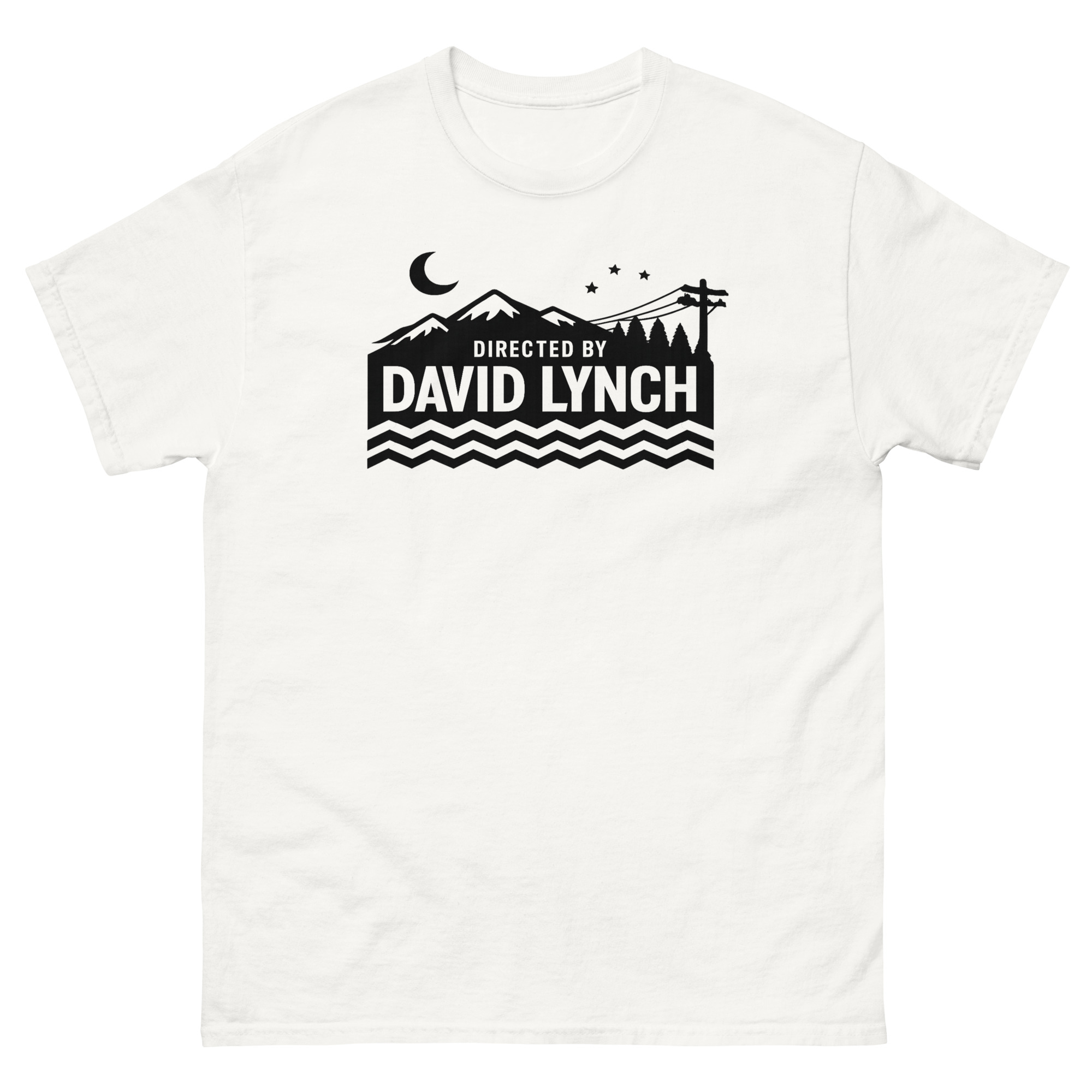The design is a masterclass in visual shorthand. The top third features the haunting silhouette of those iconic woods under a crescent moon, an instant reference to Twin Peaks. A lone utility pole with buzzing lines cuts through the frame, humming with unseen energy. The bottom third is dominated by the stark, mesmerizing Black Lodge chevron pattern. Sandwiched powerfully between these iconic landscapes is the bold, block-text credit: “DIRECTED BY DAVID LYNCH.” This meta-commentary is the shirt’s genius. By wearing it, you’re not just advertising a filmmaker; you’re framing your reality as his next project. The definitive look for lovers of surreal art films.