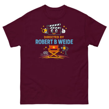 Let’s zoom in on the masterpiece on your chest. Central to the design, of course, are those iconic end credits text: “DIRECTED BY” in vibrant orange and “ROBERT B WEIDE” in bold blue. But this is more than a simple copy-paste from the screen. Instead, we’ve built a whole cartoon scene around it, transforming a moment of defeat into a celebration.