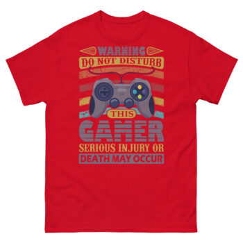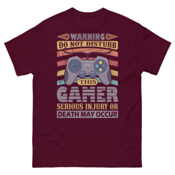 The mock caution message—”WARNING: DO NOT DISTURB THIS GAMER. SERIOUS INJURY OR DEATH MAY OCCUR”—isn’t just funny; it’s relatable. Paired with the retro controller graphic, this gaming session warning shirt turns your personal space into a no-fly zone.