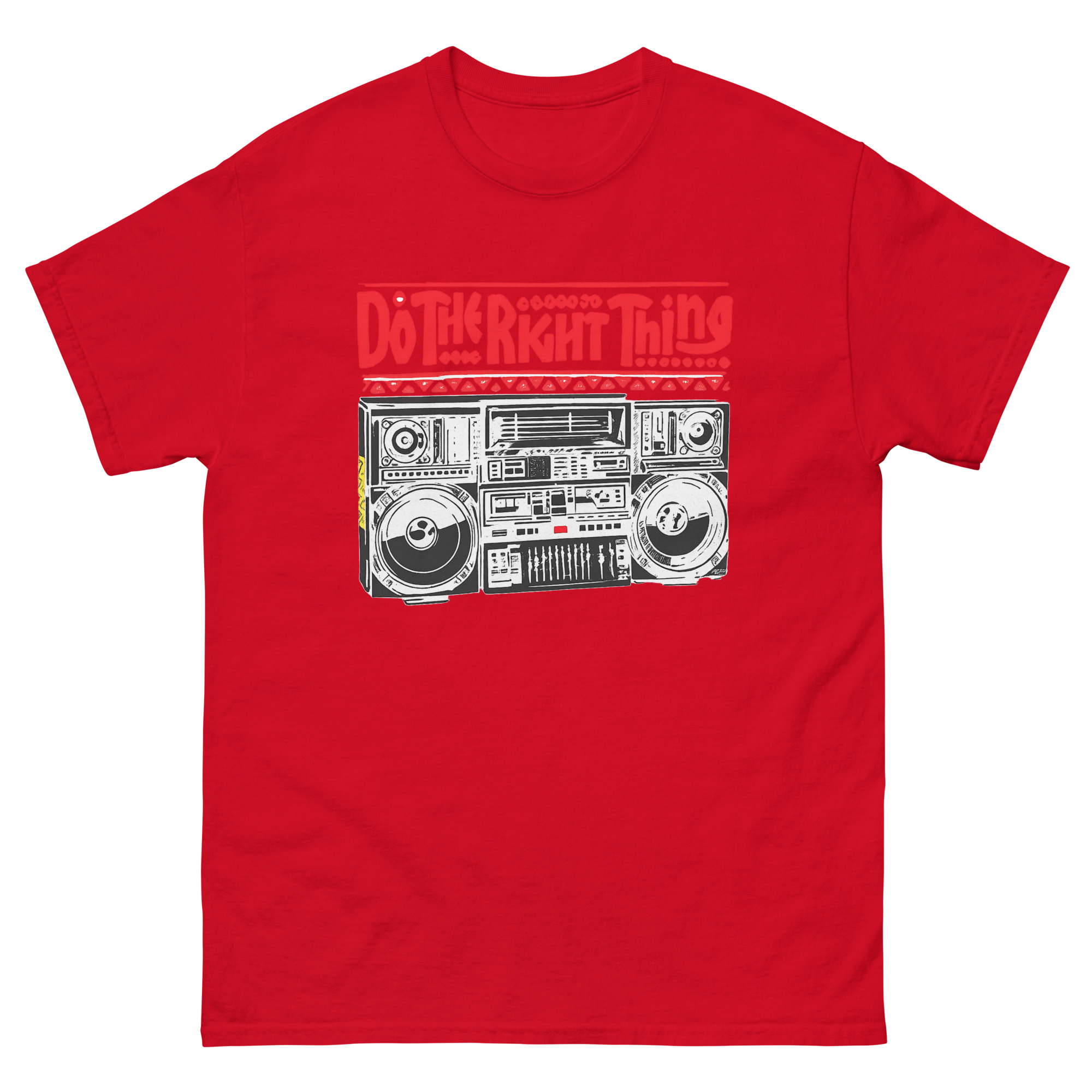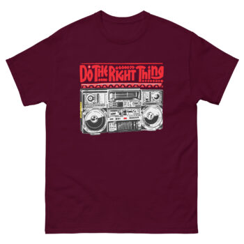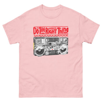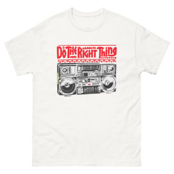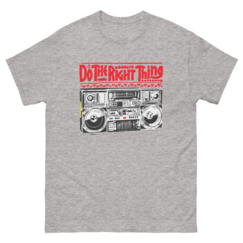 The inspiration comes from a hot summer day in 1989. In the film, Radio Raheem’s ghetto blaster isn’t just playing Public Enemy; it’s blasting a declaration. It’s the sound of identity, resistance, and community. That powerful image a person holding their ground with music as their weapon, stuck with us. We wanted to create a shirt that honored that moment in cinema history while making the message personal. Therefore, our design focuses on Raheem’s legendary boombox, detailed down to the knobs and cassettes. Above it, the bold, red command “DO THE RIGHT THING” hits you with the urgency of graffiti. This tee asks you a question: What does fighting the power look like in your world?