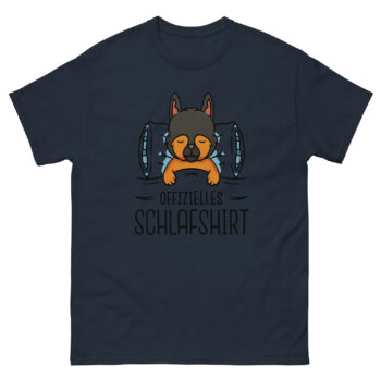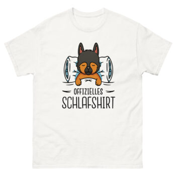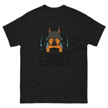 Design: Centered cartoon of a sleeping Doberman with “OFFIZIELLES SCHLAFSHIRT” text