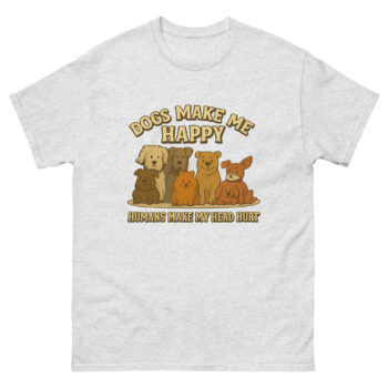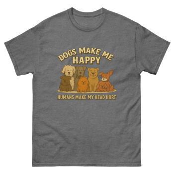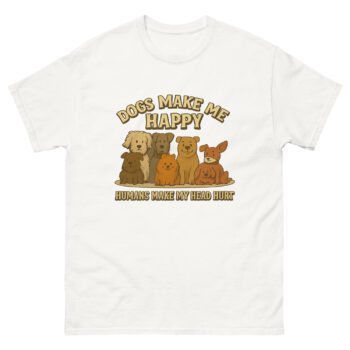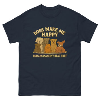 This black unisex t-shirt features a playful illustration of five adorable dogs beneath the bold quote: “Dogs Make Me Happy – Humans Make My Head Hurt.” The warm, earthy tones and cartoon-style art give it a friendly, eye-catching vibe.