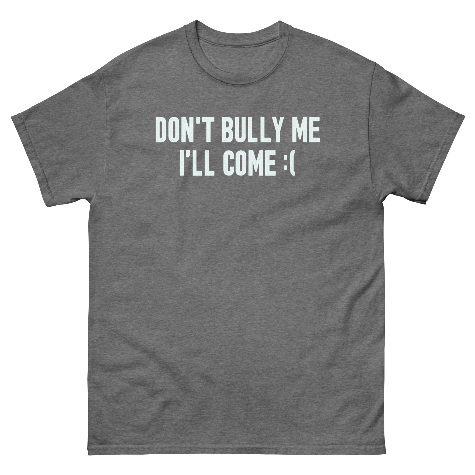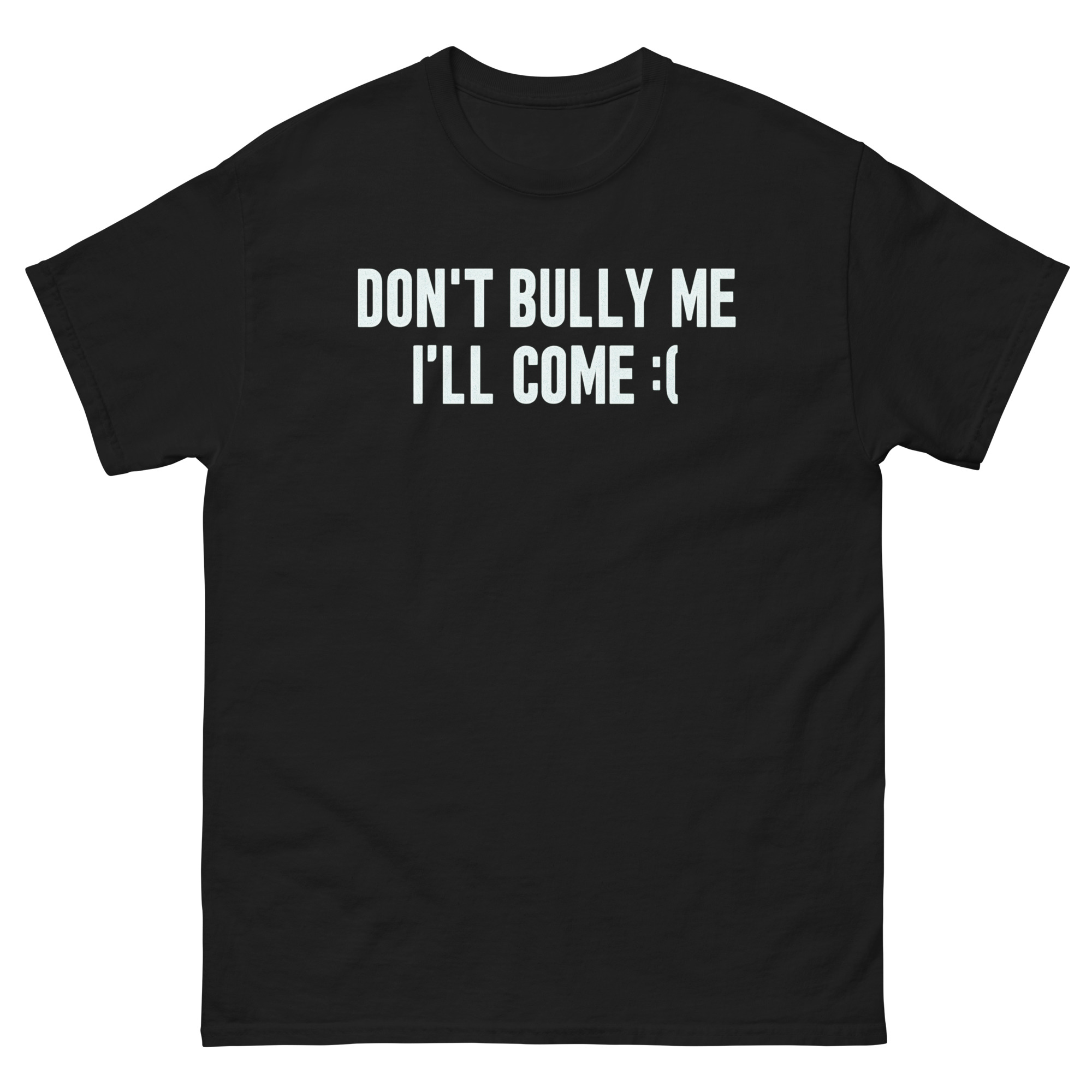 The power of this shirt lies in its brutal simplicity. There are no fancy graphics. Instead, the design relies entirely on a bold, text-based statement that stops people in their tracks. In stark white letters on a classic black tee, the phrase “DON’T BULLY ME I’LL COME :(” says everything.