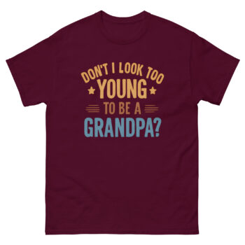 Featuring bold, retro-style typography in eye-catching orange, yellow, and blue, this cool grandpa t-shirt funny gift makes a statement without saying a word. The playful phrase “Don’t I Look Too Young To Be A Grandpa?” is guaranteed to get laughs—whether he’s wearing it to a family BBQ or his first grandchild’s birthday party.