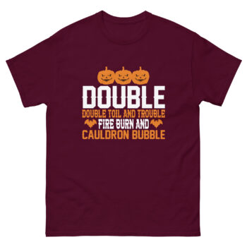 Bring a touch of classic witchcraft to your wardrobe with the Double Double Toil and Trouble Halloween T-shirt. Featuring iconic Halloween text and playful pumpkin and bat accents, this tee is perfect for Shakespeare lovers, spooky enthusiasts, and October partygoers.
