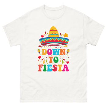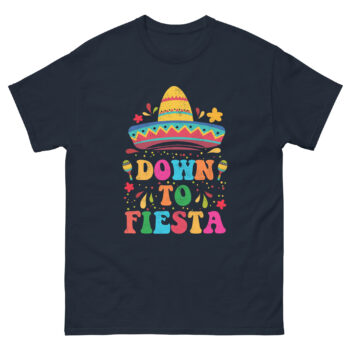 This shirt design has a bold, festive look with a giant colorful sombrero and the phrase “Down to Fiesta”, making it ideal for Cinco de Mayo, fiesta parties, or Latin-themed events.