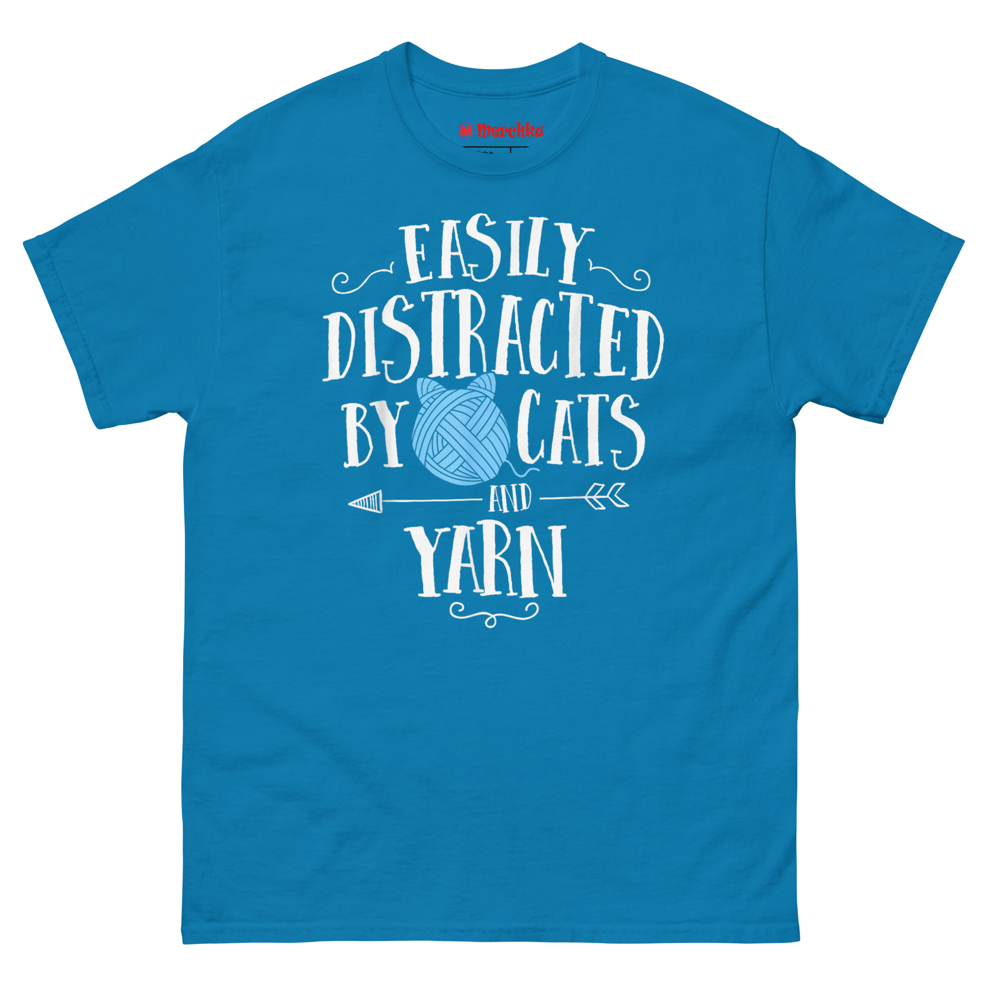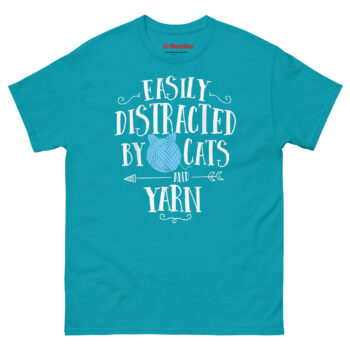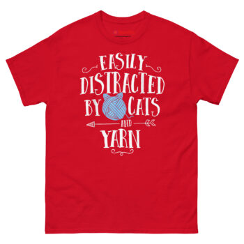 Ready to wear your heart on your sleeve, right next to the cat hair? Grab your Easily Distracted by Cats and Yarn T Shirt now. Click your size above to add this funny knitting t-shirts for local craft group members to your cart. Whether it’s a birthday gift for a grandmother who knits or a treat for yourself, this shirt celebrates the beautiful distraction of making and meowing. Order now and let everyone know what really captures your attention.