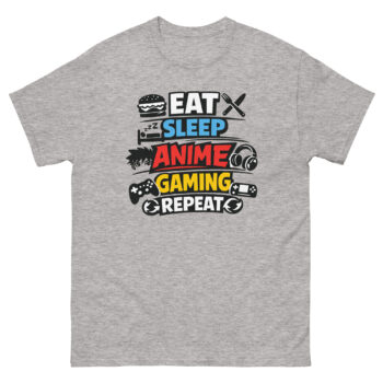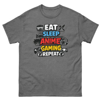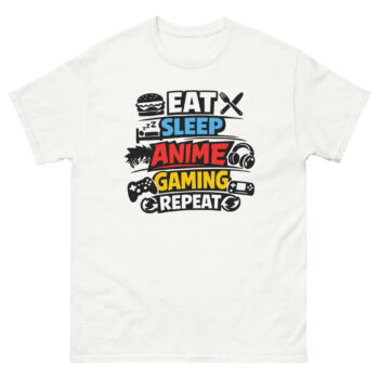 We created this graphic tee to be a wearable emblem for the community. Instead of a standard horizontal print, we went with a striking vertical layout that draws the eye. Each element was chosen with purpose: the burger for “Eat,” the calm blue “Zzz” for “Sleep,” the spiky Shonen-style hair and headphones for “Anime,” and the bright yellow console controller for “Gaming.” The “Repeat” arrows at the bottom tie it all together, celebrating the dedicated cycle so many of us love. Whether you’re planning a binge-watch of a new manga adaptation or grinding through an RPG to level up, this design gets it. It’s a nod of recognition to fellow fans, otaku, and multiplayer grinders alike—a simple statement that this is your world.