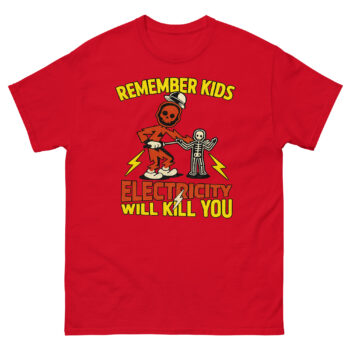 Centered on the chest, the bold white text “REMEMBER KIDS” sits above the main event. Below it, the two skeletons, one red, one white, are surrounded by energetic yellow lightning bolts. Finally, the punchline “ELECTRICITY WILL KILL YOU” anchors the design with deadpan finality.
