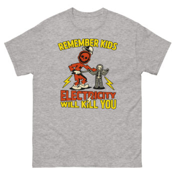 Remember those old, overly-dramatic safety videos from science class? The ones that treated every electrical outlet like a ticking time bomb? This Electricity Will Kill You shirt captures that exact spirit. It’s a retro warning graphic tee that doesn’t just make a statement, it starts a conversation. For anyone with a taste for dark humor fashion, this shirt is a wearable piece of satire.