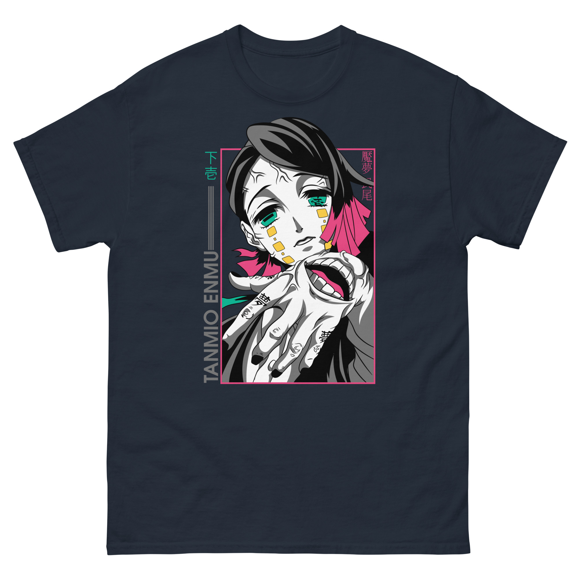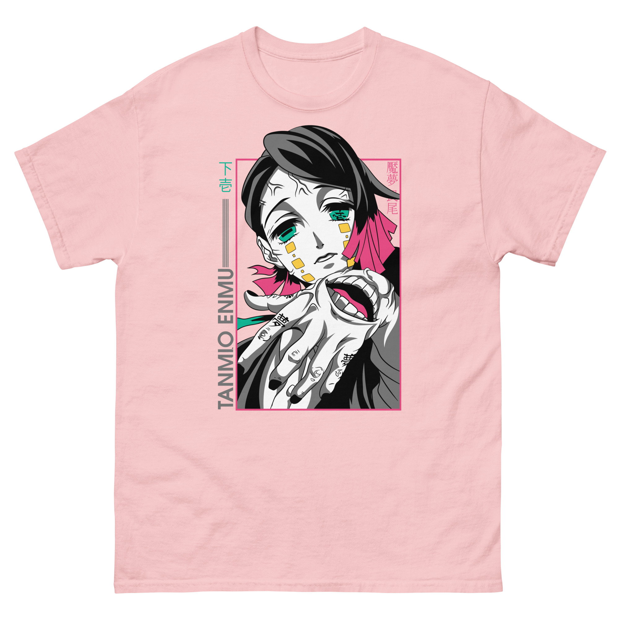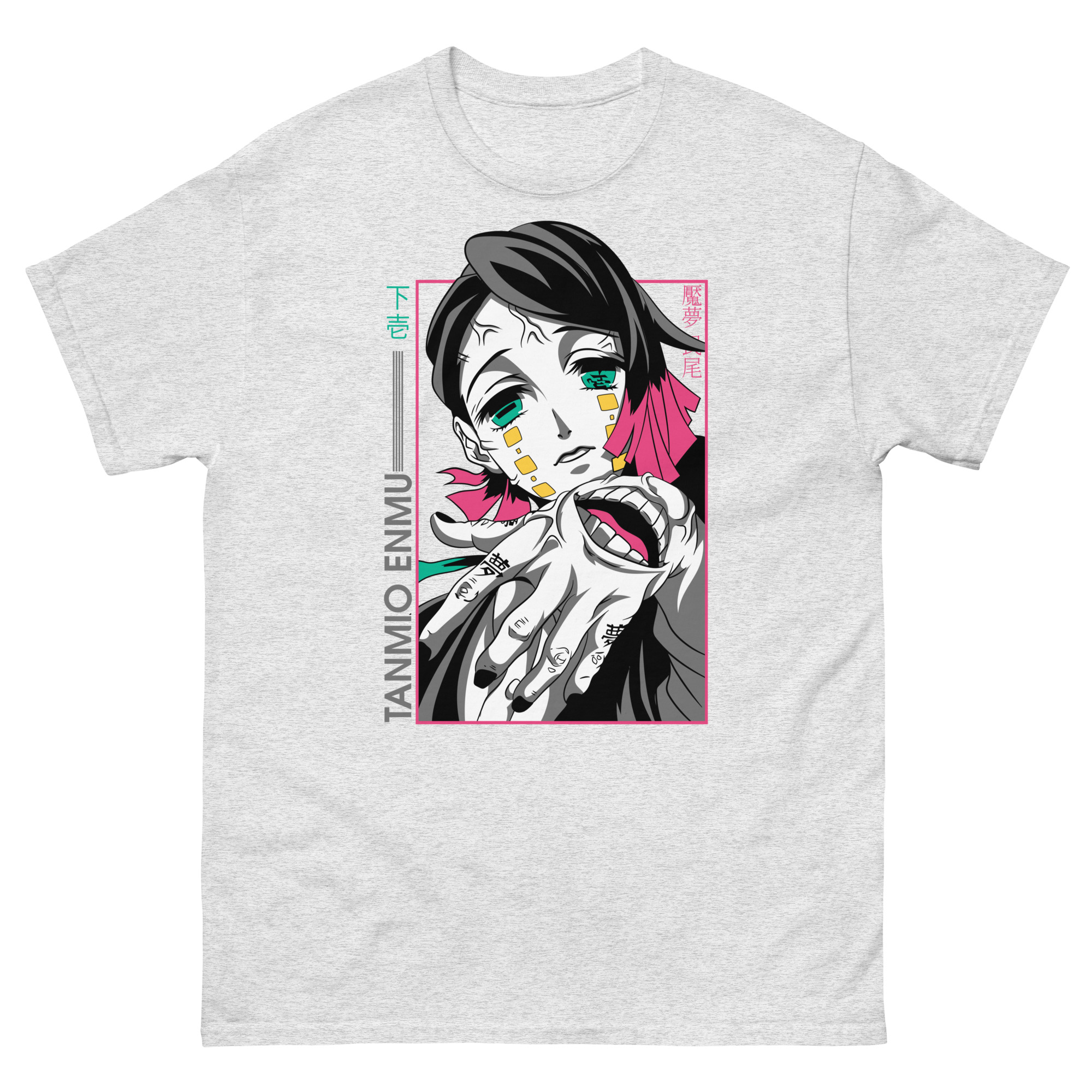 Let’s explore the artistry that makes this graphic tee a conversation piece. The central portrait uses high-contrast colors to make Enmu’s gaze absolutely captivating. Surrounding him, you’ll find key Japanese text: “下弦” (Lower Moon) and his name, “魘夢” (Enmu). These authentic details show our expertise and respect for the source material, speaking directly to devoted fans. The prominent hand motif isn’t just for show; it’s a direct reference to his manipulative powers, acting as a constant reminder of his role among the mighty 12 Kizuki. Framed in pink, the entire composition feels like a snapshot from a dream or a trap you’re willingly stepping into.