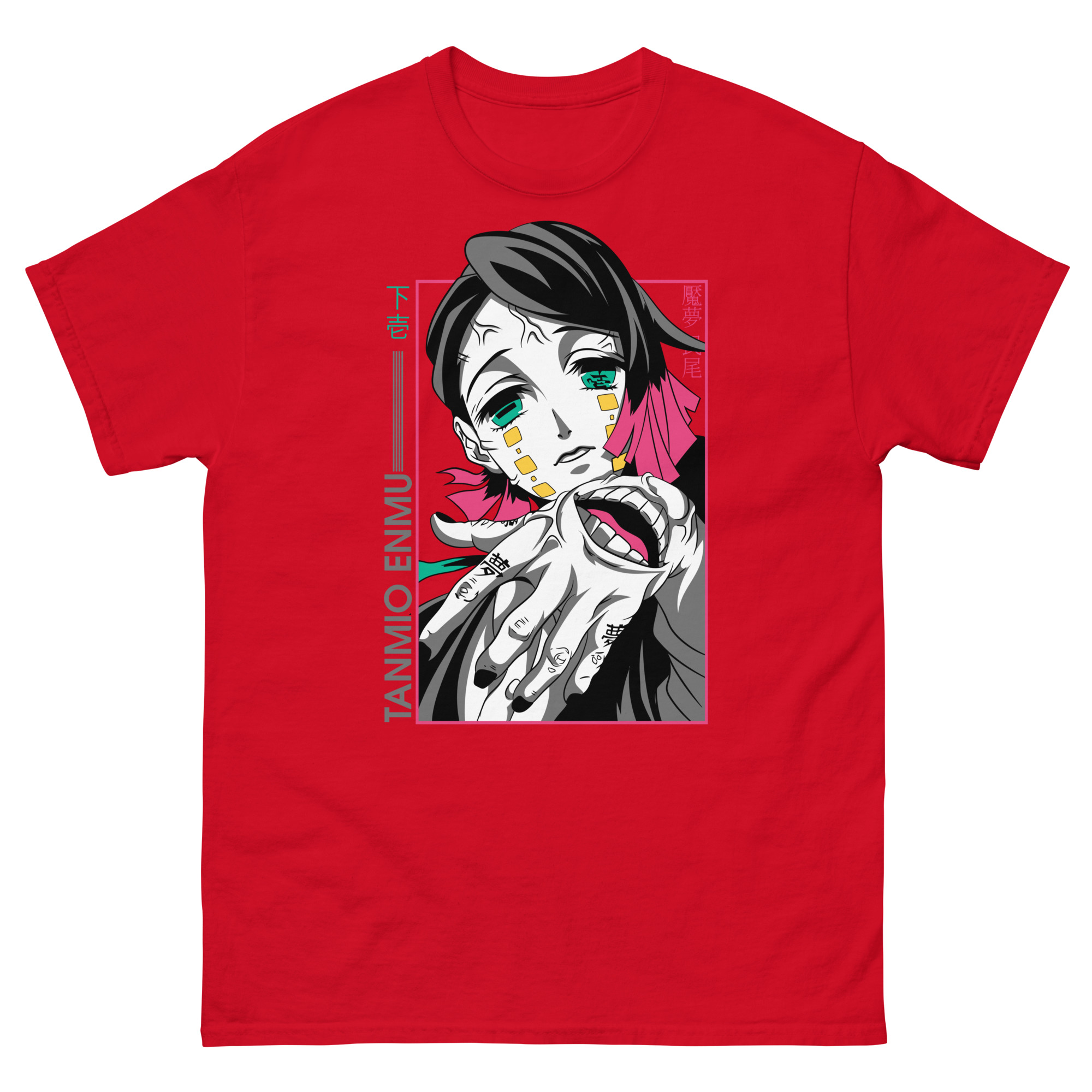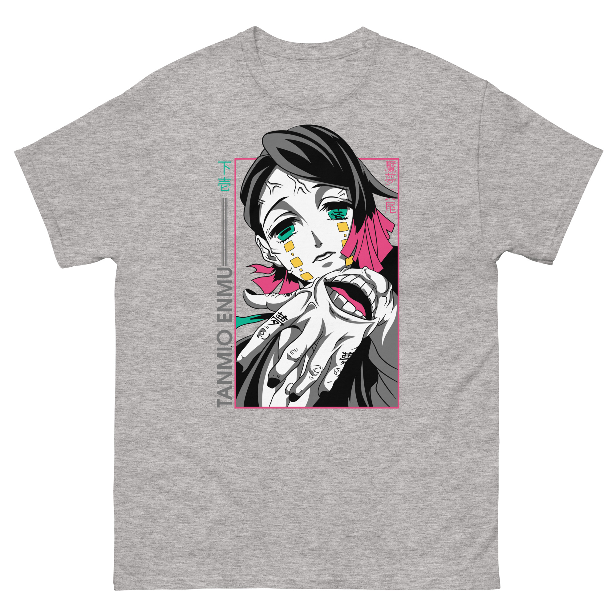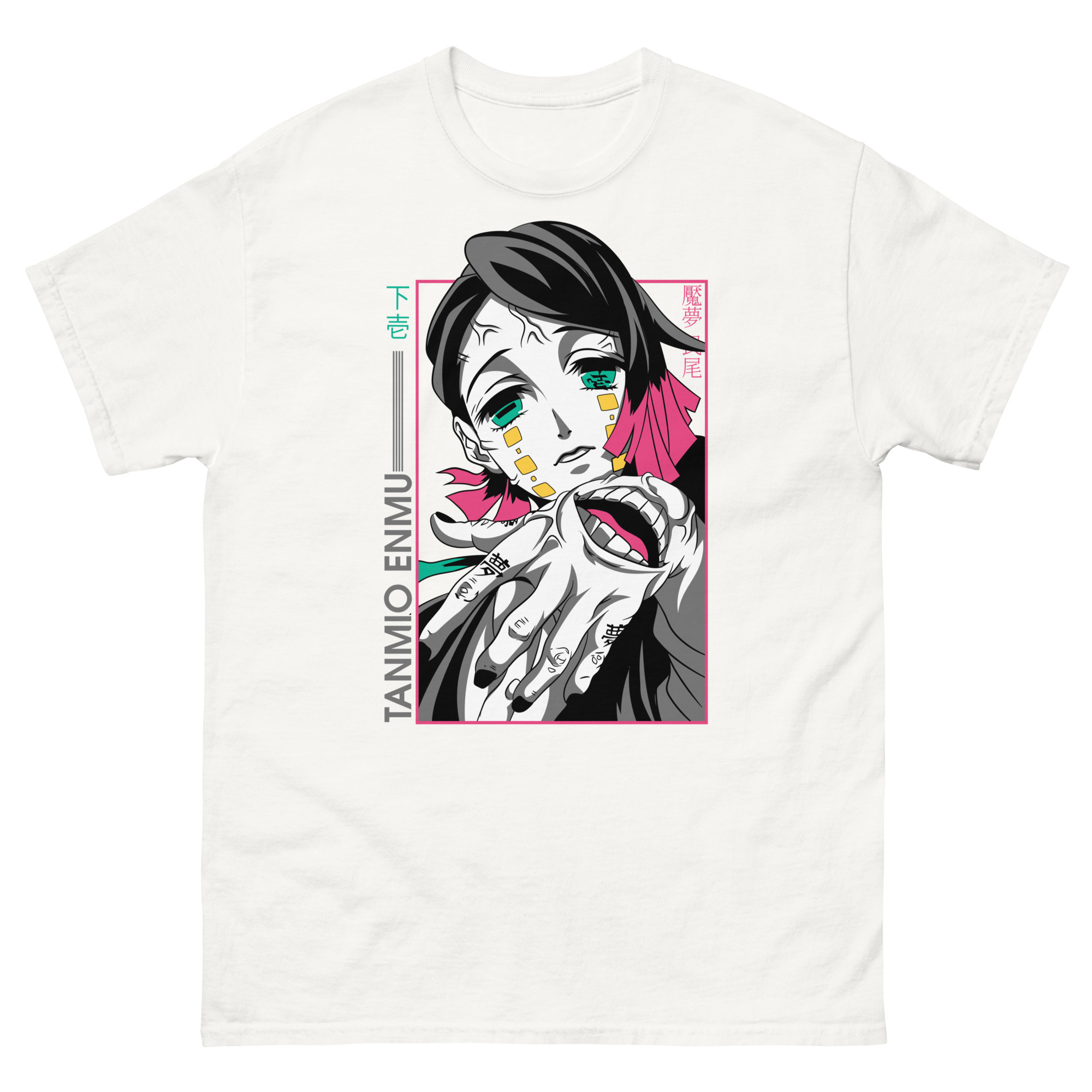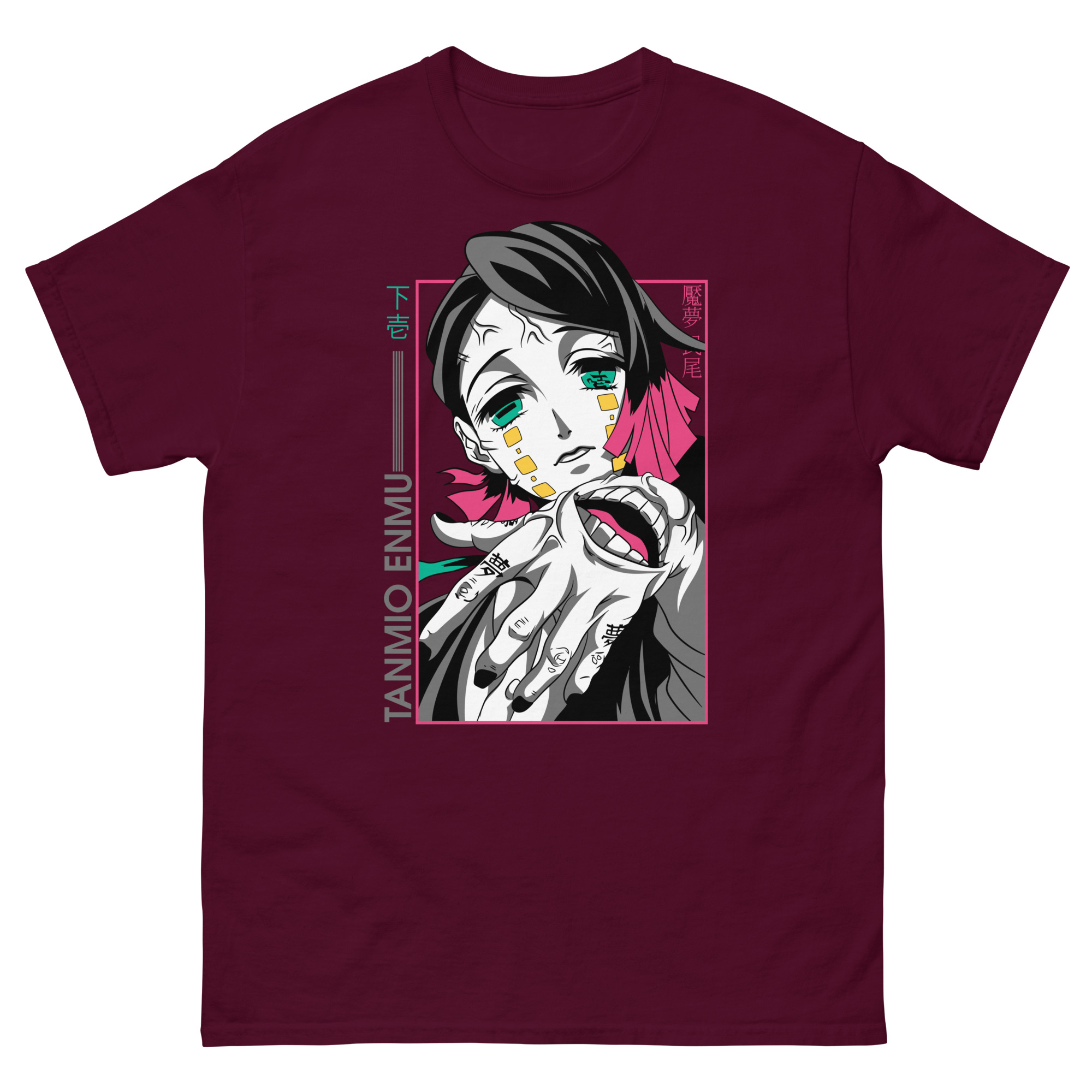 Let’s explore the artistry that makes this graphic tee a conversation piece. The central portrait uses high-contrast colors to make Enmu’s gaze absolutely captivating. Surrounding him, you’ll find key Japanese text: “下弦” (Lower Moon) and his name, “魘夢” (Enmu). These authentic details show our expertise and respect for the source material, speaking directly to devoted fans. The prominent hand motif isn’t just for show; it’s a direct reference to his manipulative powers, acting as a constant reminder of his role among the mighty 12 Kizuki. Framed in pink, the entire composition feels like a snapshot from a dream or a trap you’re willingly stepping into.