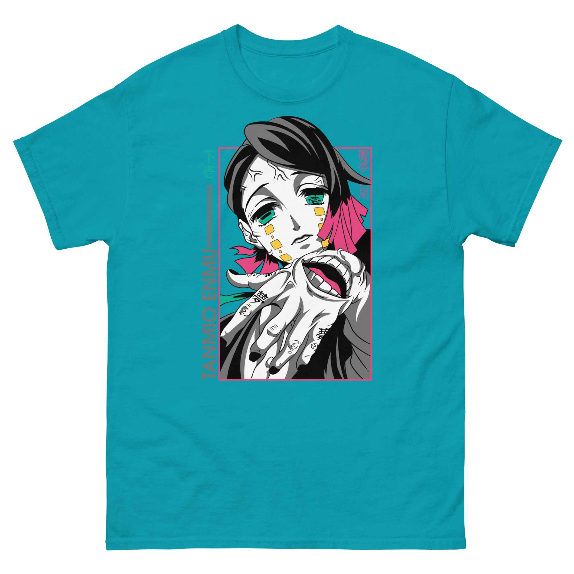 While everyone celebrates the heroes, our design team felt a pull toward the complexity of the antagonists. During the Infinite Train movie, Enmu’s quiet menace stood out. He wasn’t about brute force; his power was subtle, invasive, and deeply psychological. We became obsessed with translating that feeling onto fabric. How could we capture the duality of his pink, dreamy aesthetic and his truly sinister goals? The answer lay in every detail: his piercing teal eyes, the haunting mouth on his hand, and the hypnotic Japanese text inscribed on his palm. This Enmu shirt is the result, a wearable tribute to narrative depth.