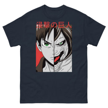 Let’s explore the details that make this graphic tee so unique. The clean split down the middle represents Eren’s dual nature perfectly. On one hand, you see the determined soldier of the Scout Regiment. Conversely, the other side reveals the raw, monstrous power that will eventually trigger the Rumbling. The bold, red Japanese characters for “Shingeki no Kyojin” crown the design, anchoring it in authentic manga style. This Eren Yeager shirt is a conversation starter, designed for those who appreciate art that makes you think.