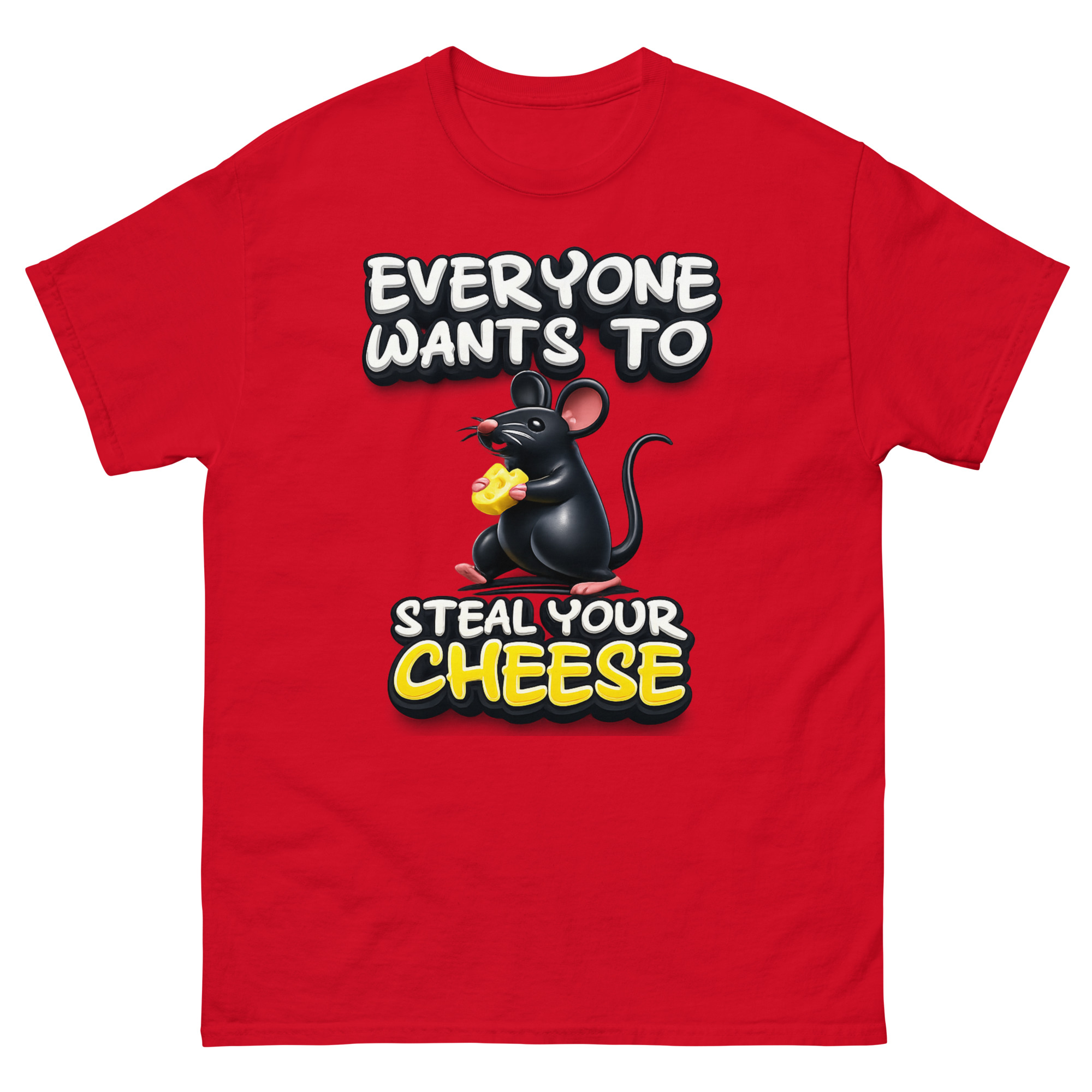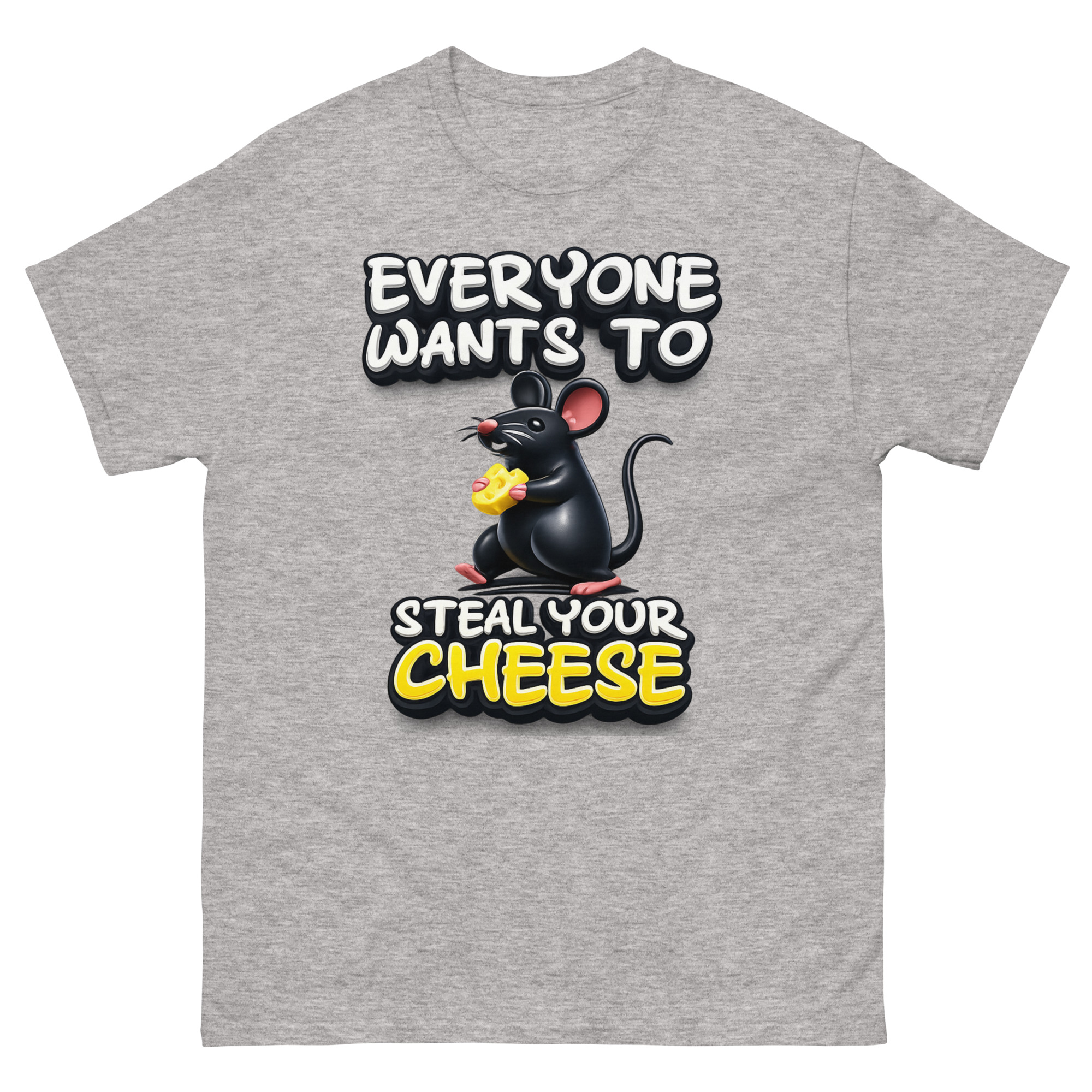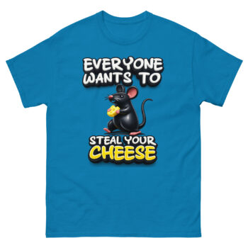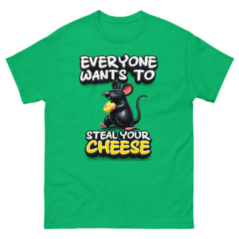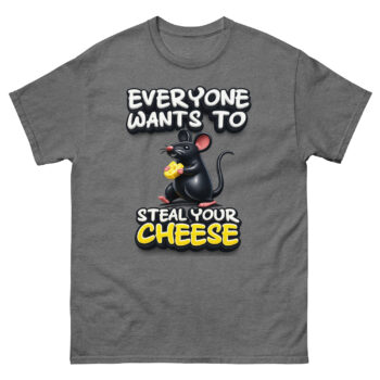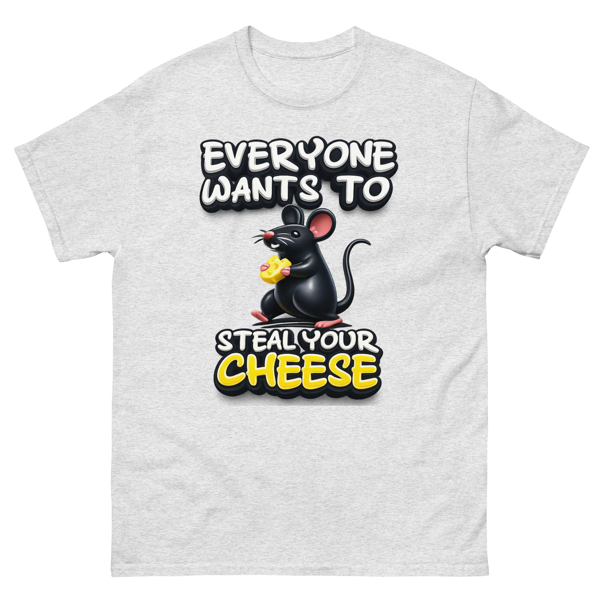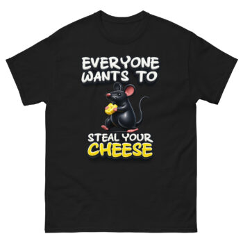 The Everyone Wants to Steal Your Cheese Shirt is a short-sleeve, 100% cotton classic tee featuring a bold cartoon mouse clutching a piece of cheese. Designed for people who love clever graphics and want to make a statement, this shirt combines humor with everyday wisdom. Whether you’re an entrepreneur, a student, or just someone who values what’s yours, this tee speaks your truth.