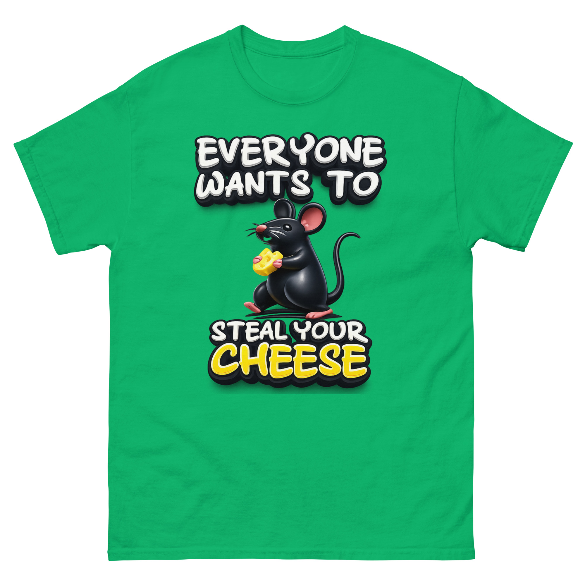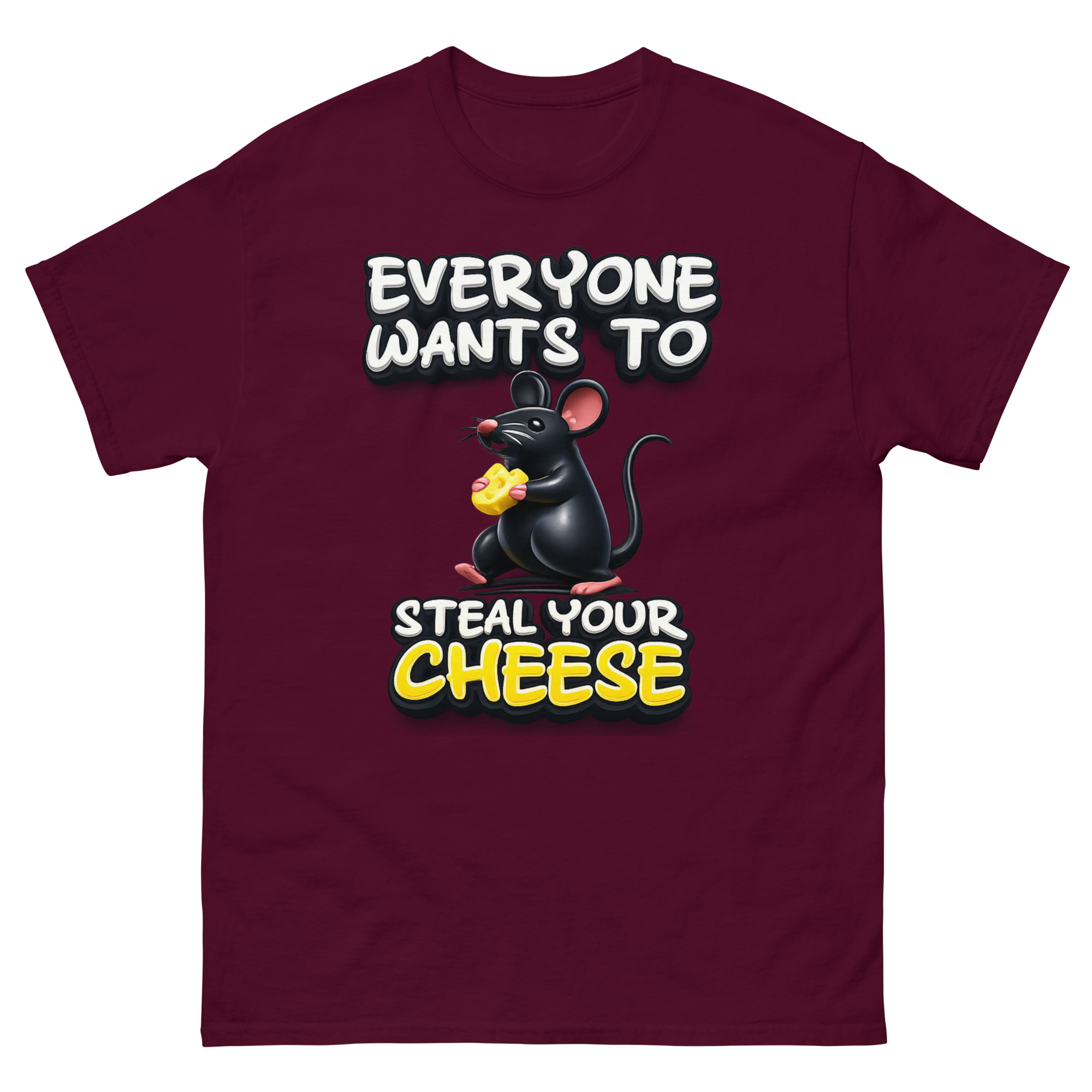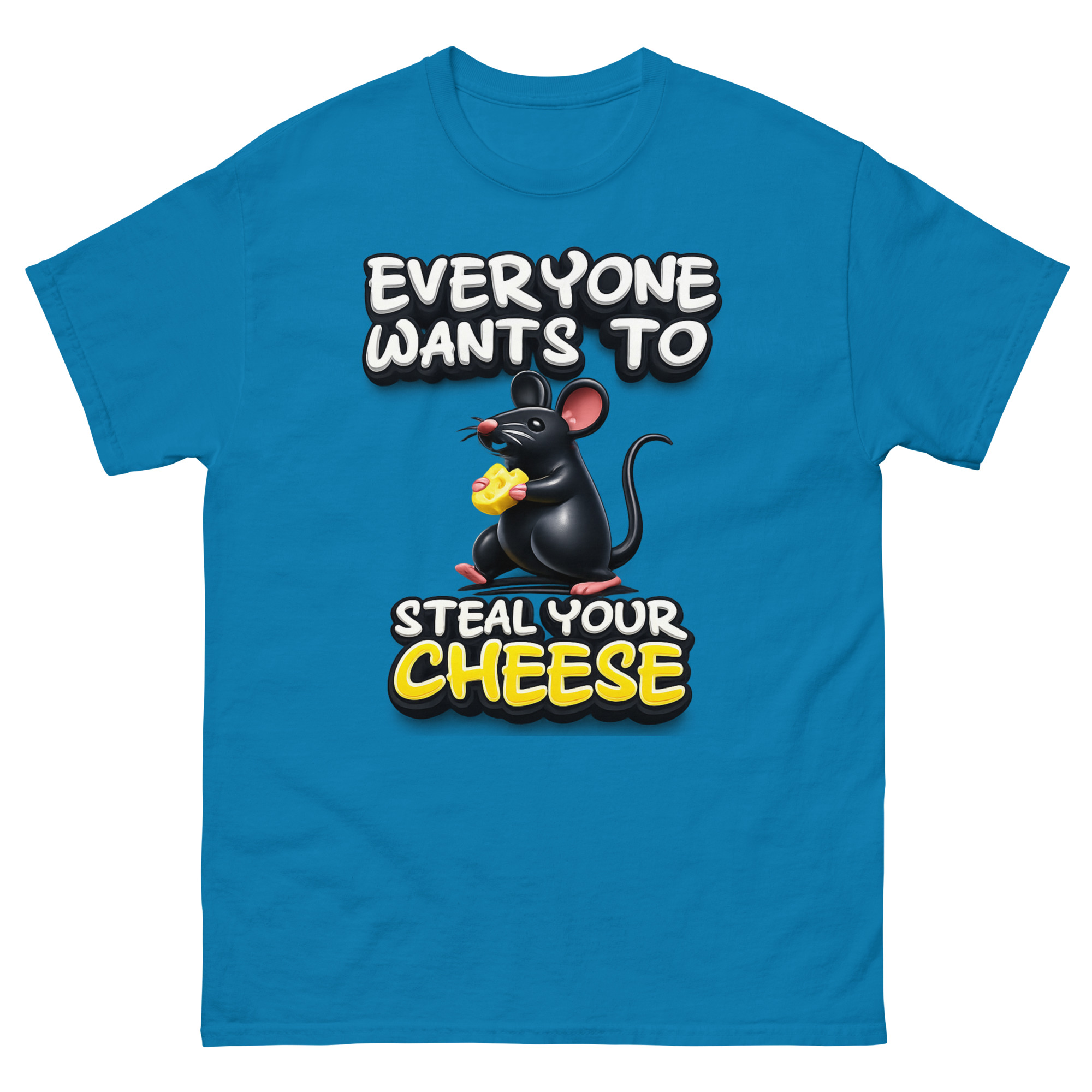 The Everyone Wants to Steal Your Cheese Shirt is a short-sleeve, 100% cotton classic tee featuring a bold cartoon mouse clutching a piece of cheese. Designed for people who love clever graphics and want to make a statement, this shirt combines humor with everyday wisdom. Whether you’re an entrepreneur, a student, or just someone who values what’s yours, this tee speaks your truth.