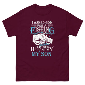 The bold typography reads: “I Asked God for a Fishing Partner, He Sent Me My Son.” This powerful phrase resonates with Christian fathers who see their children as divine gifts. Unlike generic fishing shirts, this faith-based fishing shirt with son carries a deeper meaning—one that strengthens family ties through spirituality.