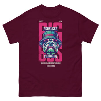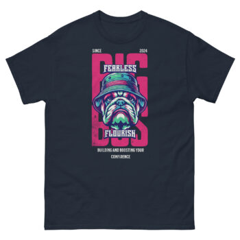 Featuring a helmeted bulldog radiating determination, this urban style dog lover gift shirt makes a statement before you even say a word. The bold “FEARLESS” and “FLOURISH” text bookend the design, while the oversized “BIG” in pink adds a punch of attitude. The motivational tagline—”BUILDING AND BOOSTING YOUR CONFIDENCE”—turns this from mere apparel into a confidence-boosting dog owner graphic tee that’s as empowering as it is stylish.