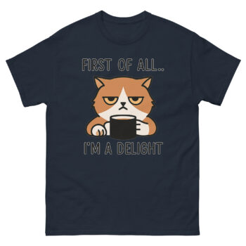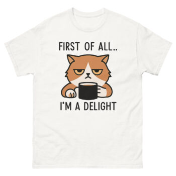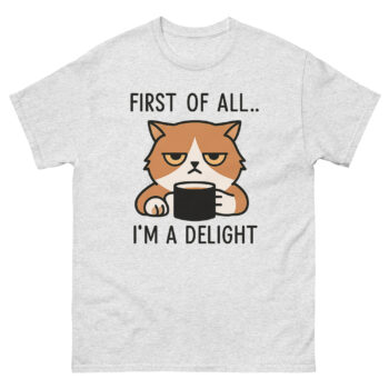 Don’t let this sassy feline slip away! Whether you’re grabbing coffee or passively judging the world, this First of All I’m a Delight Cat T-Shirt is your perfect companion.