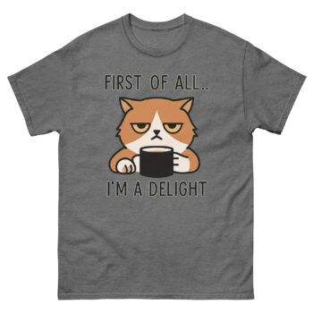 First of All I’m a Delight – Hilarious Grumpy Cat Coffee T-Shirt for Sarcastic Pet Lovers