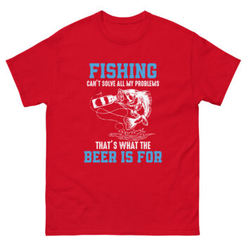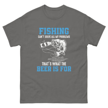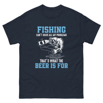 With its bold distressed font, eye-catching blue highlights, and a fish clutching a beer bottle, this tee perfectly blends humor and passion. The quote, “Fishing Can’t Solve All My Problems, That’s What the Beer Is For,” is a witty nod to every angler’s two favorite pastimes.