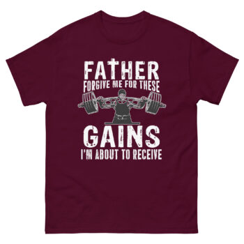 Show off your strength and sense of humor with this “Forgive Me for These Gains” t-shirt. Featuring a devoutly ripped design, it’s perfect for gym-goers who lift with faith, hustle, and unapologetic intensity. Whether you’re pressing plates or preaching pump, this tee brings laughs and looks in and out of the gym.