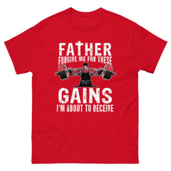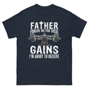 The bold graphic reads: “Father, Forgive Me for These Gains I’m About to Receive.” It’s a playful twist on a classic prayer, making it one of the most funny spiritual gym t-shirts for muscle gains out there. The design features a muscular lifter pressing a barbell, symbolizing strength—both physical and spiritual.