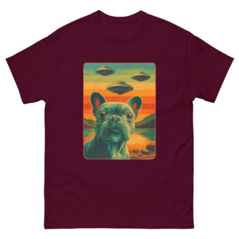 Then, you see them: three classic UFOs hovering serenely above the scene. This isn’t a random graphic; it’s a masterful mashup of 70s sci-fi album art and modern dog-loving humor. The result is a retro sci-fi french bulldog graphic tee that feels both nostalgic and utterly fresh. It’s a frenchie ufo graphic tee that sparks curiosity and stands as a brilliant piece of wearable art, far surpassing typical novelty shirts.