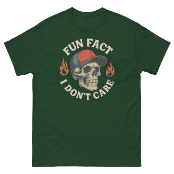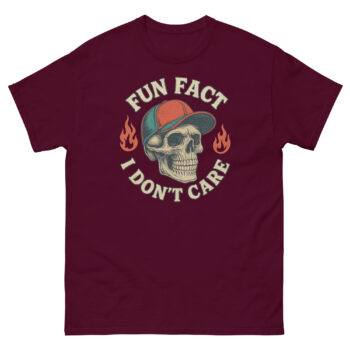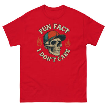 Flanking the skull, bold red flames add a shot of heat and intensity. They hint at a fiery spirit that simply chooses its battles wisely. The words “FUN FACT” sit at the top, while “I DON’T CARE” anchors the bottom in a perfectly distressed, vintage font. Consequently, this sarcastic humor design isn’t mean-spirited. Instead, it’s a clever and ironic shield against unnecessary noise, making it the perfect unapologetic attitude tee.