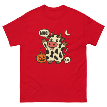 Looking for the perfect Halloween shirt that’s equal parts adorable and spooky? Our Funny Cow Halloween T-Shirt is here to steal the spotlight! Featuring a cheerful cartoon cow with a playful “MOO!” speech bubble, this cute moo cow spooky t-shirt for men and women blends Halloween fun with irresistible charm. Flanked by a carved pumpkin and a tiny skull, the design sits under a crescent moon with stars, making it the ultimate Halloween animal lover tee with cartoon cow and jack-o-lantern.
