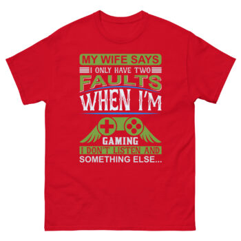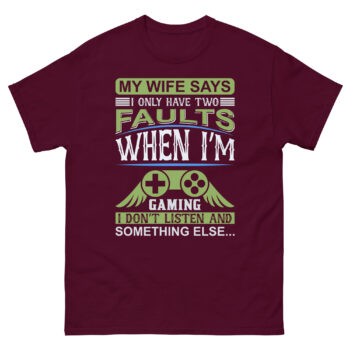 A hilarious gamer t-shirt featuring the quote “My wife says I only have two faults when I’m gaming – I don’t listen and something else.” Perfect funny gift for married gamers and video game lovers.