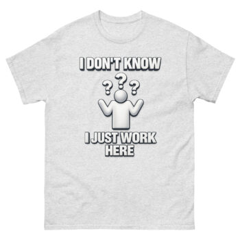 I Don’t Know I Just Work Here Shirt – White Shrugging 3D Icon Tee