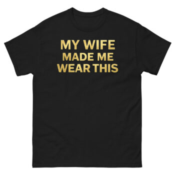 My Wife Made Me Wear This Shirt – Bold Gold Text Graphic Tee