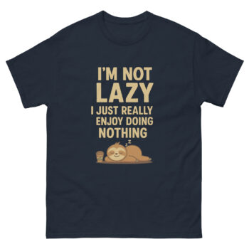 The bold white text “I’M NOT LAZY I JUST REALLY ENJOY DOING NOTHING” isn’t just a slogan—it’s a mood. Paired with an adorable, blissed-out sloth sprawled beside a drink cup and floating “zzz” bubbles, this sloth doing nothing t-shirt captures the essence of guilt-free relaxation.