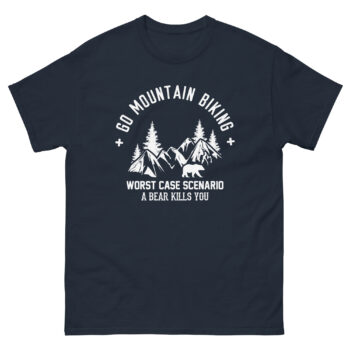 For riders who live on the edge—this shirt says it all. The “Go Mountain Biking – Worst Case Scenario A Bear Kills You” tee combines outdoor adventure with a fearless sense of humor. Perfect for MTB riders, downhill bikers, or trail junkies who love the thrill (and laugh at the danger). Makes a hilarious gift for mountain bikers, campers, and anyone who isn’t afraid of bears… or jokes.