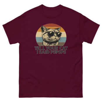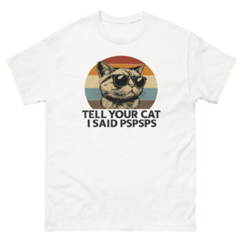 Firstly, the “pspsps” phrase is the universal code for “I come in peace, please grace me with your presence.” It’s quirky, it’s intimate, and it works almost every time. Secondly, the retro aesthetic takes us back to a simpler time—think vintage surf vibes and classic rock album covers. This combination creates a retro cat funny tee that feels both nostalgic and fresh. Ultimately, the message, “TELL YOUR CAT I SAID PSPSPS,” is a playful punchline. It’s a funny nudge to fellow cat owners, saying, “I get it. I’m one of you.”