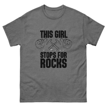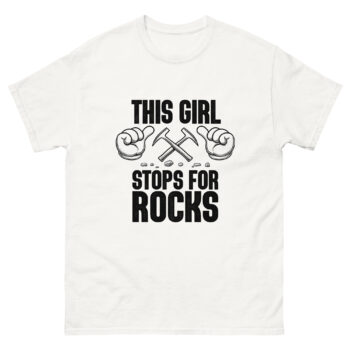 For the rock-loving girl who can’t resist pulling over to check out a good find, this shirt says it all: “This Girl Stops for Rocks.” With bold text, pointing hands, and geology hammer artwork, it’s the perfect identity tee for female rockhounds, geologists, and crystal collectors. Wear it on hikes, field trips, or to your next rock and mineral show — a fun way to share your passion with the world.