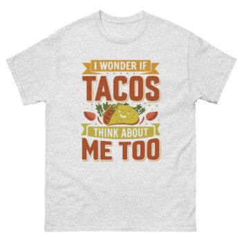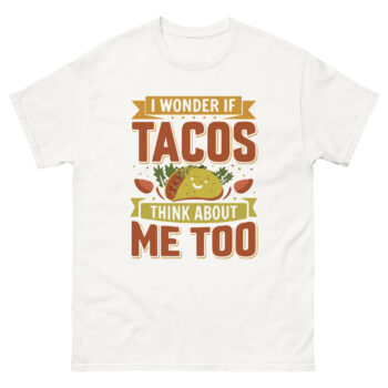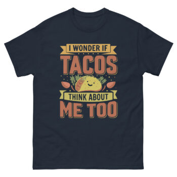 Featuring a witty quote—”I wonder if tacos think about me too”—paired with an adorable taco illustration, this Mexican food humor shirt is perfect for anyone who lives for Taco Tuesday (or any day ending in “Y”). Whether you’re hitting a Cinco de Mayo party or just lounging at home, this taco quote apparel guarantees laughs and compliments.