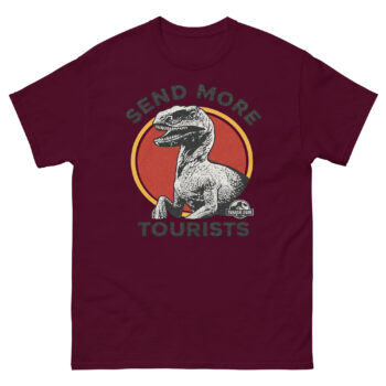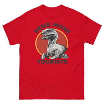 Let’s be honest: a lot of souvenir shirts are forgettable. But this one? People will remember it. The genius is in the joke. Instead of saying “Welcome” or “I ❤️ [City],” this shirt has a hungry velociraptor demanding, “SEND MORE TOURISTS.” It’s a brilliantly dark and funny twist that surprises everyone who sees it.