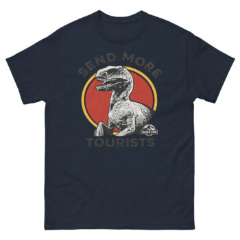 If you’re the type of person who loves dinosaurs, theme parks, or making people chuckle, this “Send More Tourists” tee is your perfect match. It’s the ultimate novelty dinosaur vacation graphic tee for bold travelers who aren’t afraid to be a little cheeky.