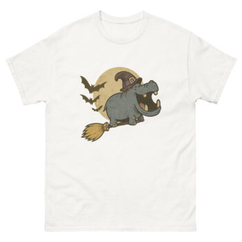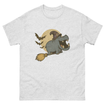 Halloween isn’t just about scares—it’s about fun, creativity, and expressing your playful side! If you’re searching for a cute animal Halloween graphic tee that stands out, our Funny Witch Hippo Halloween T-Shirt is the perfect choice. Featuring an adorable gray hippo soaring on a broomstick in a cartoon witch animal tee design, this shirt blends humor, charm, and spooky vibes effortlessly.
