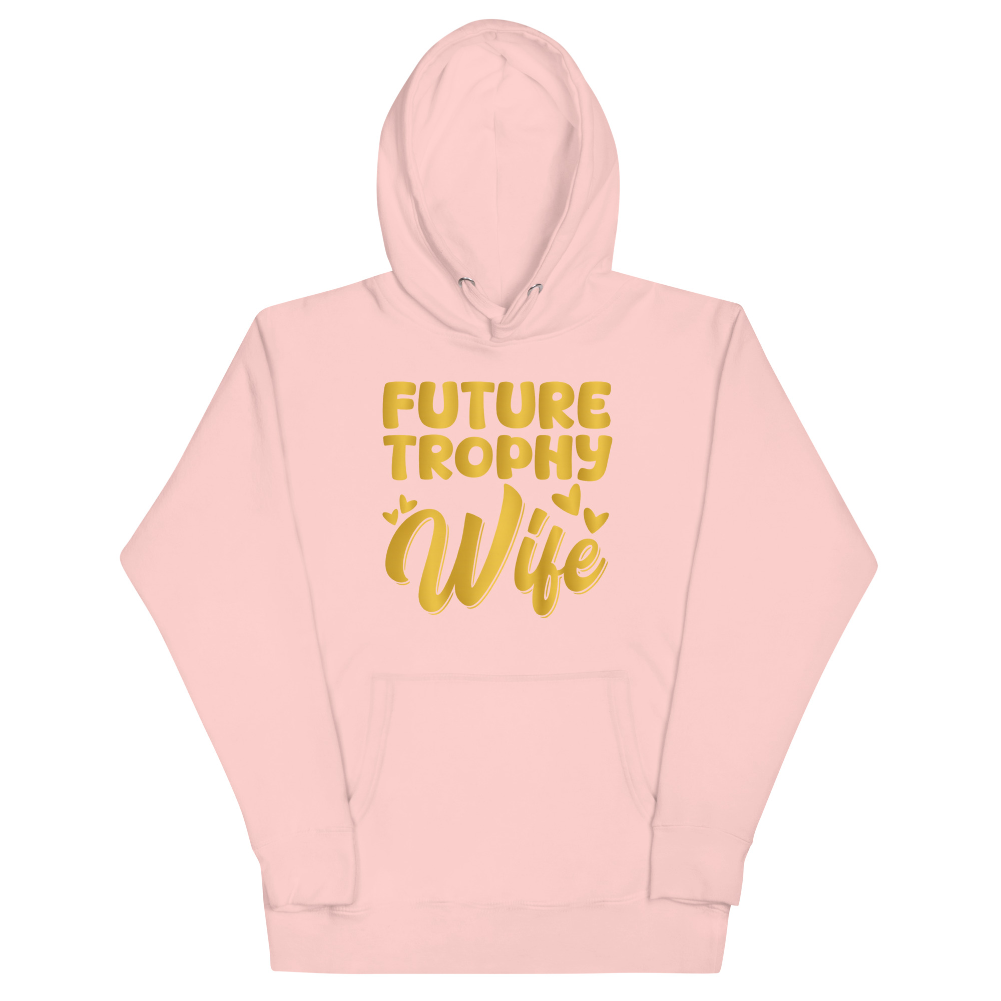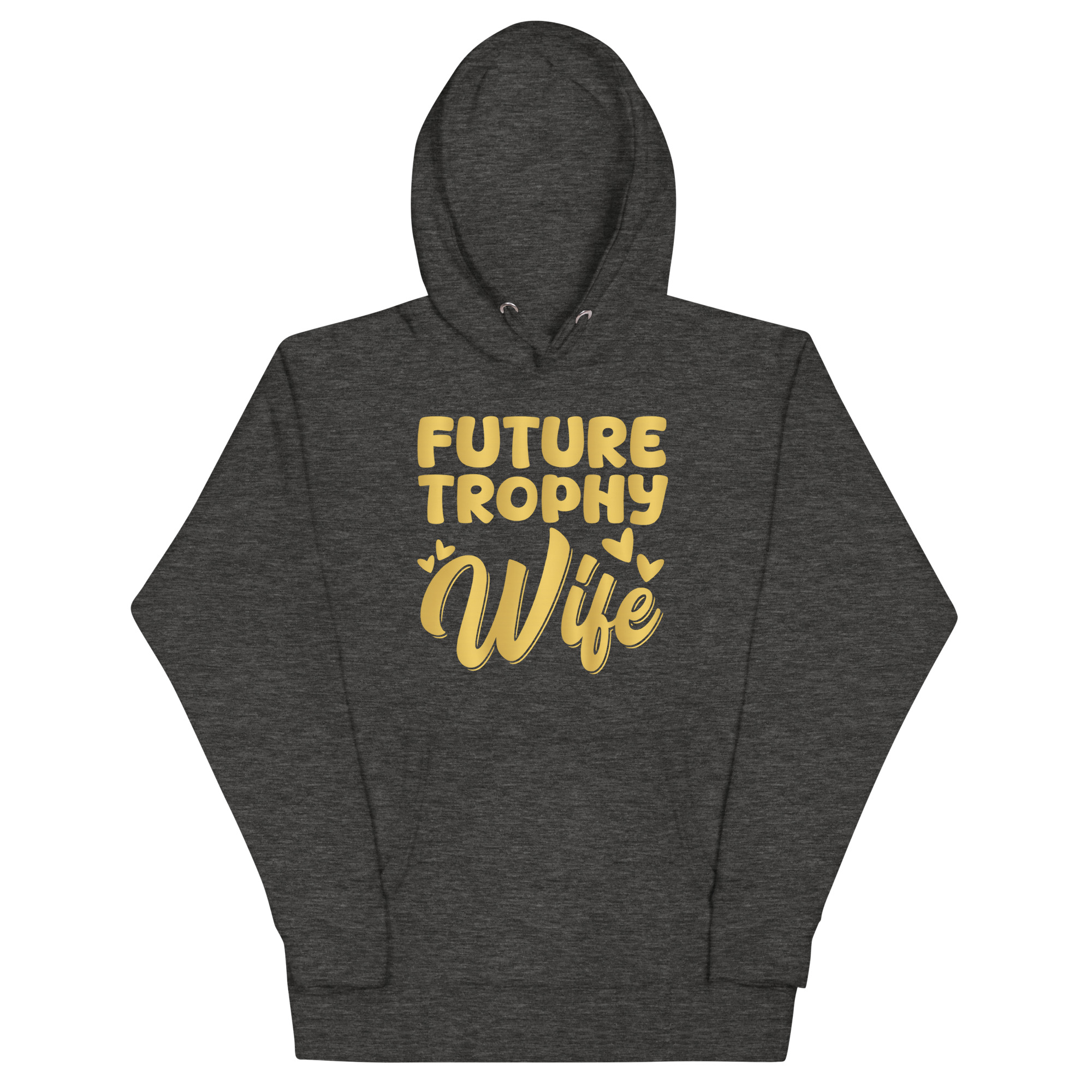 A stylish black hoodie featuring the bold, playful text “FUTURE TROPHY WIFE” in a vibrant, golden yellow font with charming heart accents. This hoodie is designed for the confident, humorous, and soon-to-be-married individual who embraces their future with wit and a touch of sass.