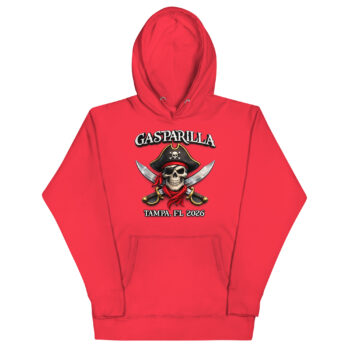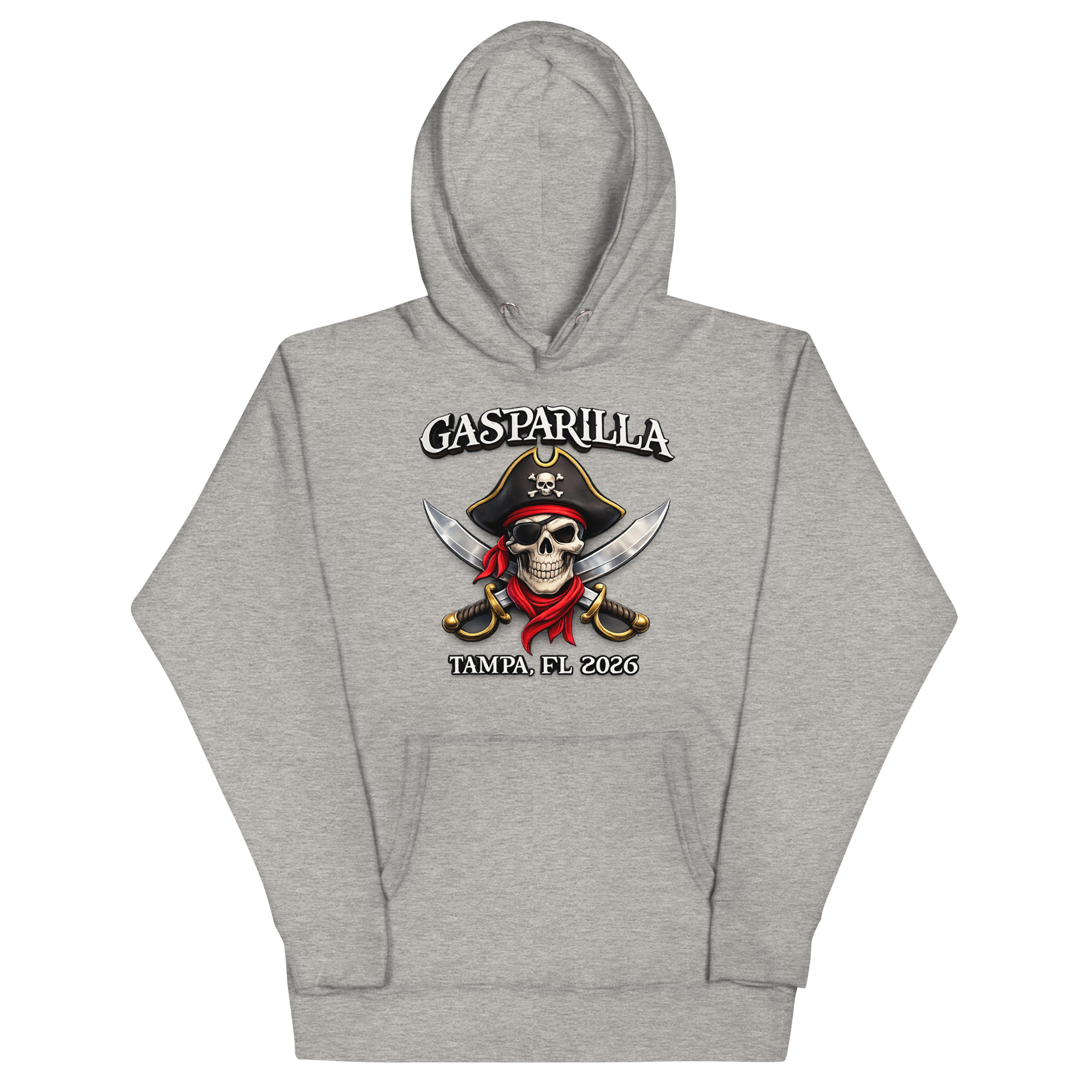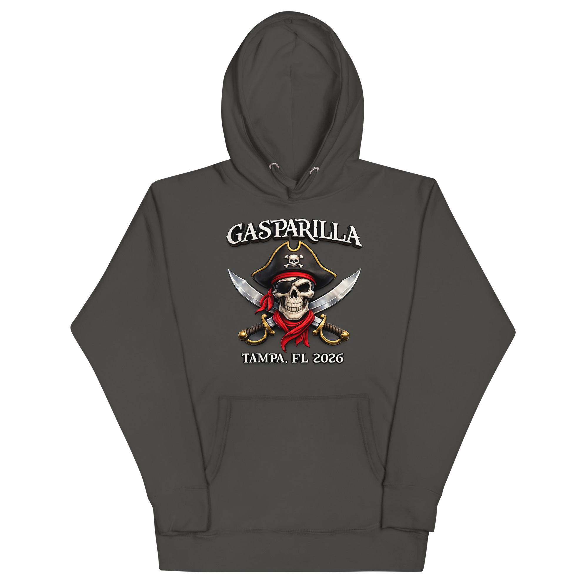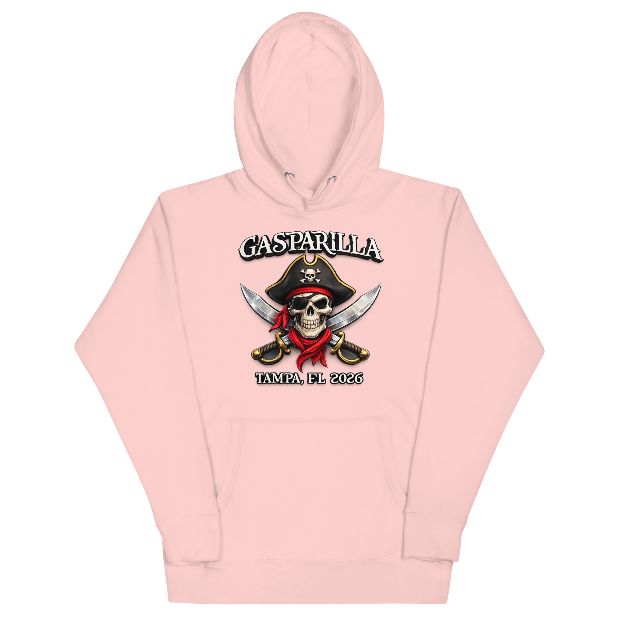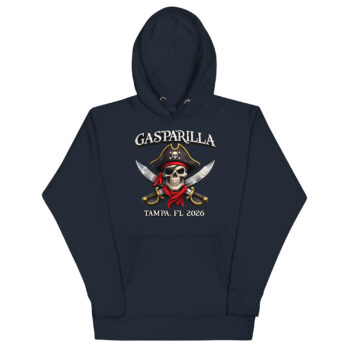 The artwork draws inspiration from the historic Gasparilla legend and the thrill of Tampa’s annual pirate parade. Our design team wanted to capture the rebellious spirit of José Gaspar with a modern twist, hence the fierce skull in a pirate hat, crossed swords, and bold typography. Whether you’re watching the flotilla or hitting the after-parties, this hoodie lets you wear the story.