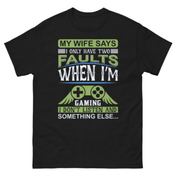 Funny Gamer Husband T-Shirt – Wife Says Two Faults Quote