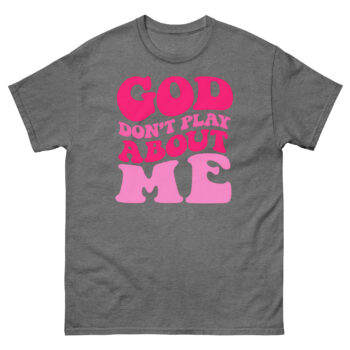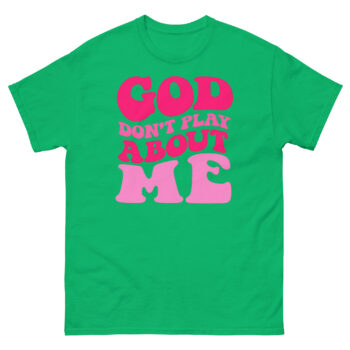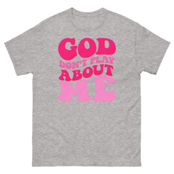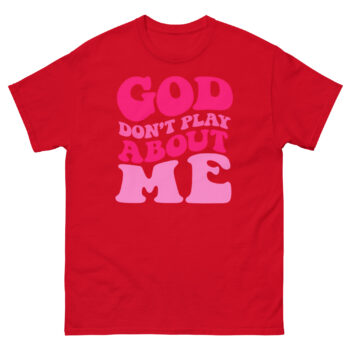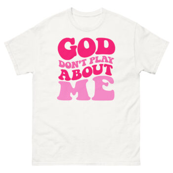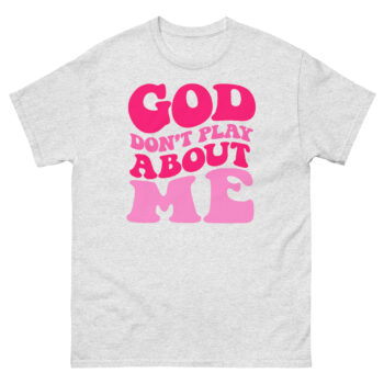 The God Don’t Play About Me Shirt is a bold, short-sleeve cotton tee designed for people who live their faith out loud. Made from 100% pre-shrunk jersey knit cotton, this classic-fit tee features a vibrant direct-to-garment print that reads “God Don’t Play About Me” in retro-style pink lettering. It’s perfect for believers who want to express spiritual confidence with style.