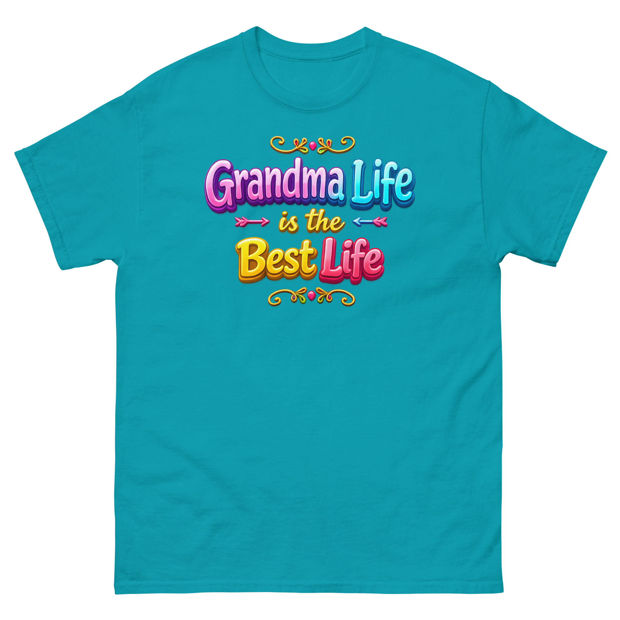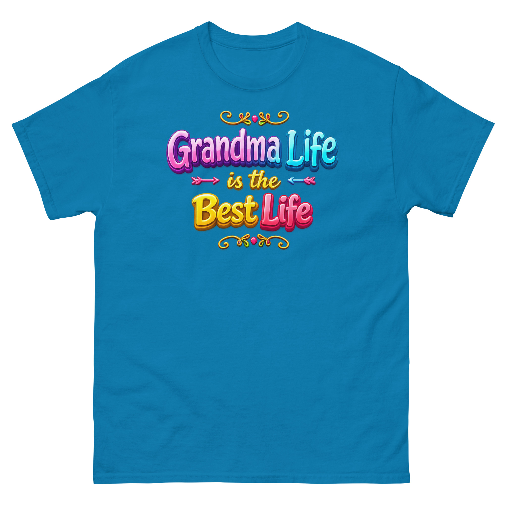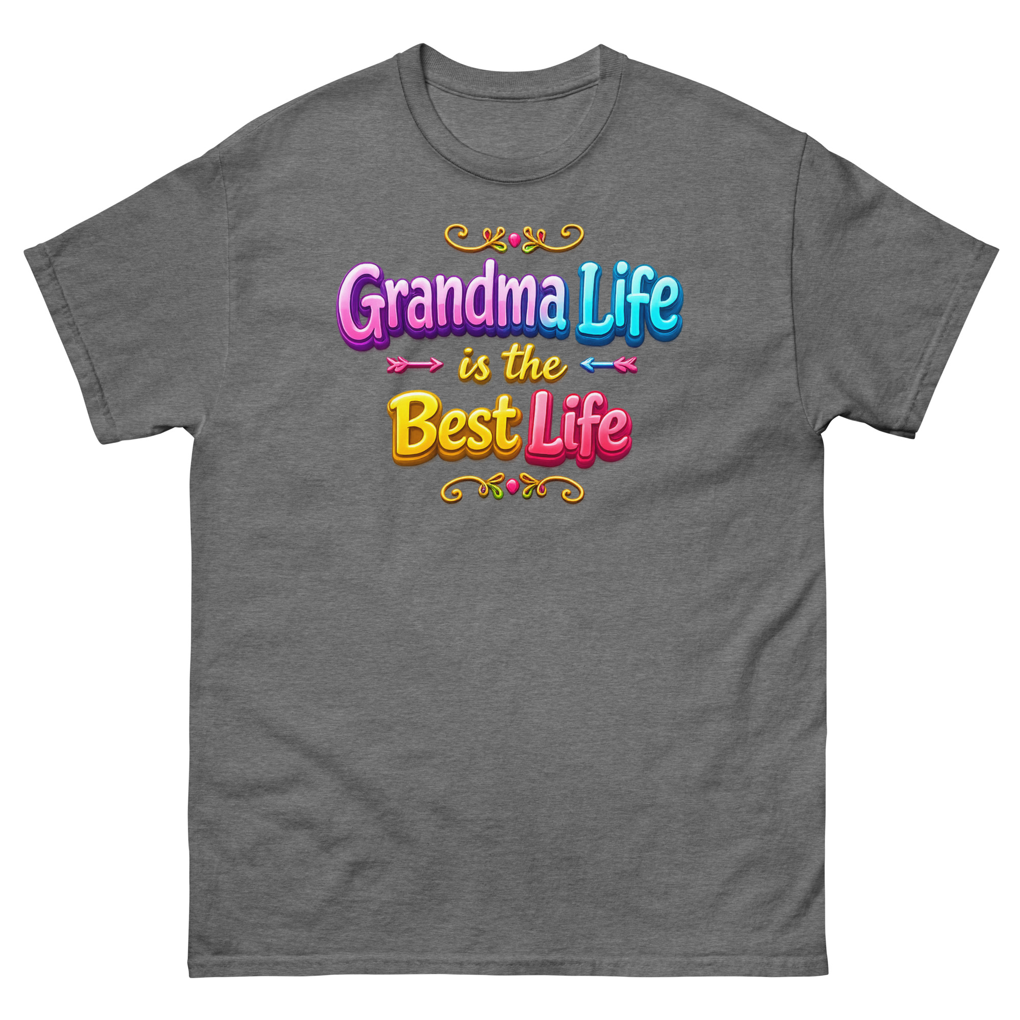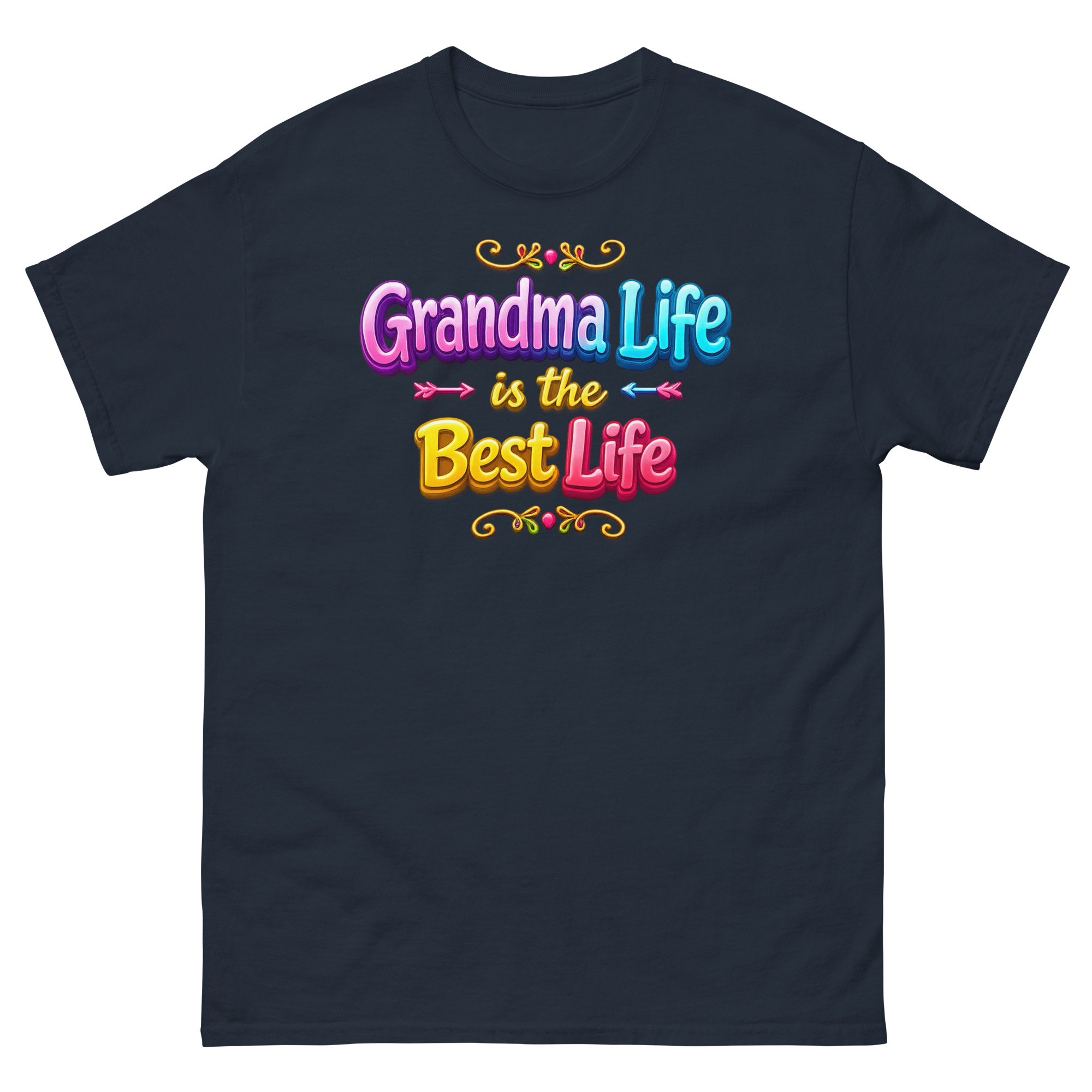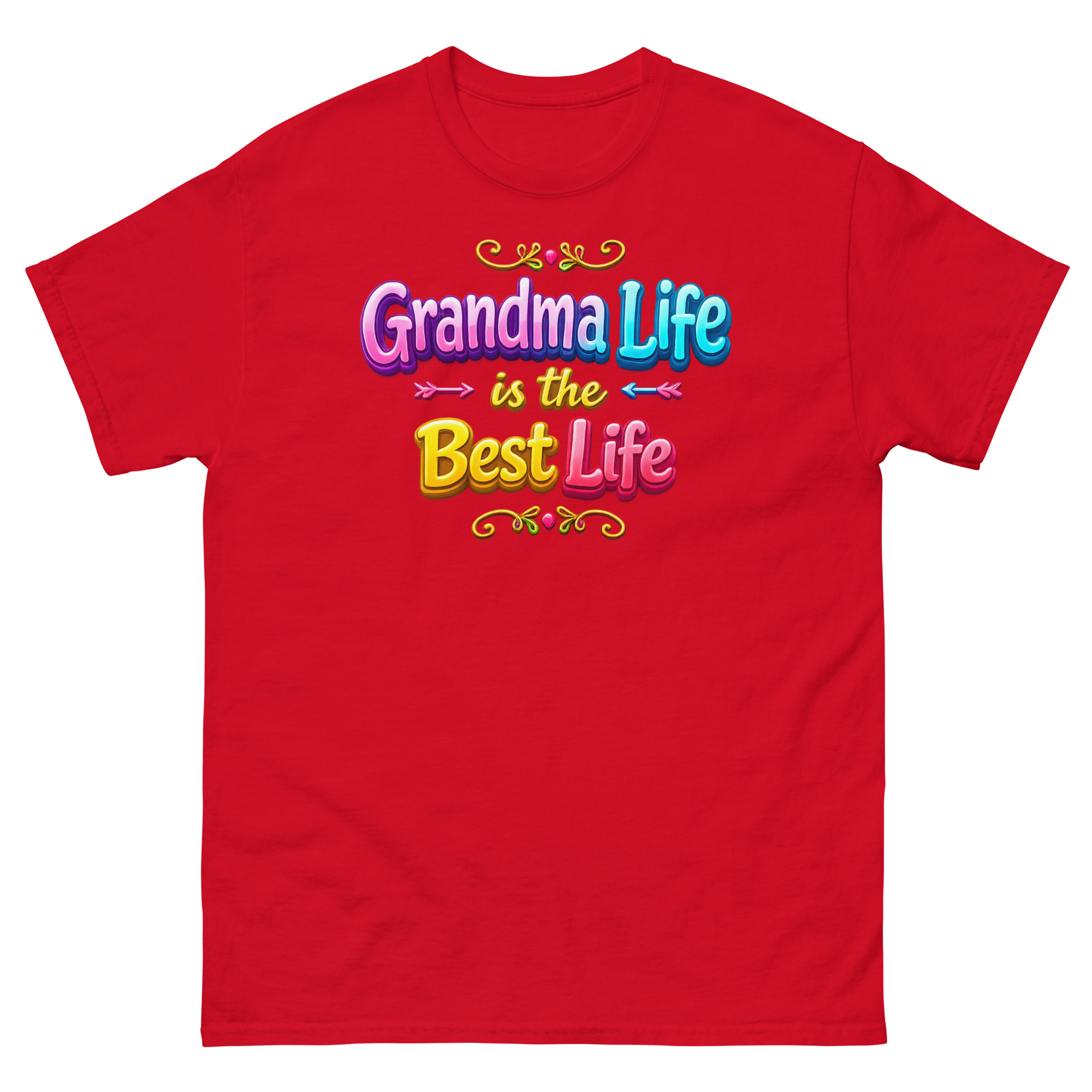 First, your eyes are drawn to the stunning 3D typography. The phrase “Grandma Life is the Best Life” pops right off the fabric with a glossy, bubble font effect that looks like cheerful candy. Specifically, graceful swirls frame bright, colorful gradient letters. Consequently, the design feels youthful, energetic, and bursting with pride. It’s the opposite of a dull, old-fashioned top. Ultimately, this typography tee makes a bold statement: grandparenting is about vibrant joy.