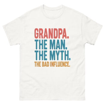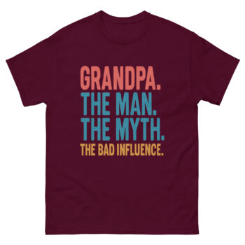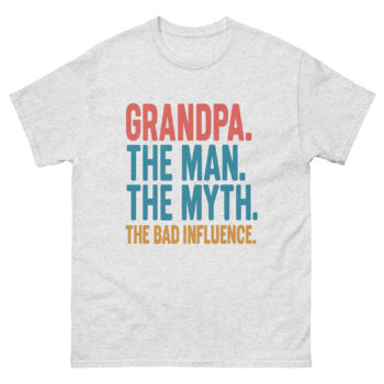 The bold, capitalized text “GRANDPA. THE MAN. THE MYTH. THE BAD INFLUENCE.” isn’t just a statement—it’s a badge of honor. Printed in eye-catching red, light blue, and orange, this cool funny shirt for grandpa ensures he’ll turn heads wherever he goes.